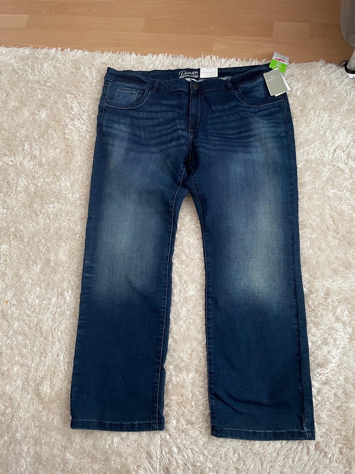 nenosené strečové rifle s jemným bielym prúžkom, 100 % stav, veľkosť 44