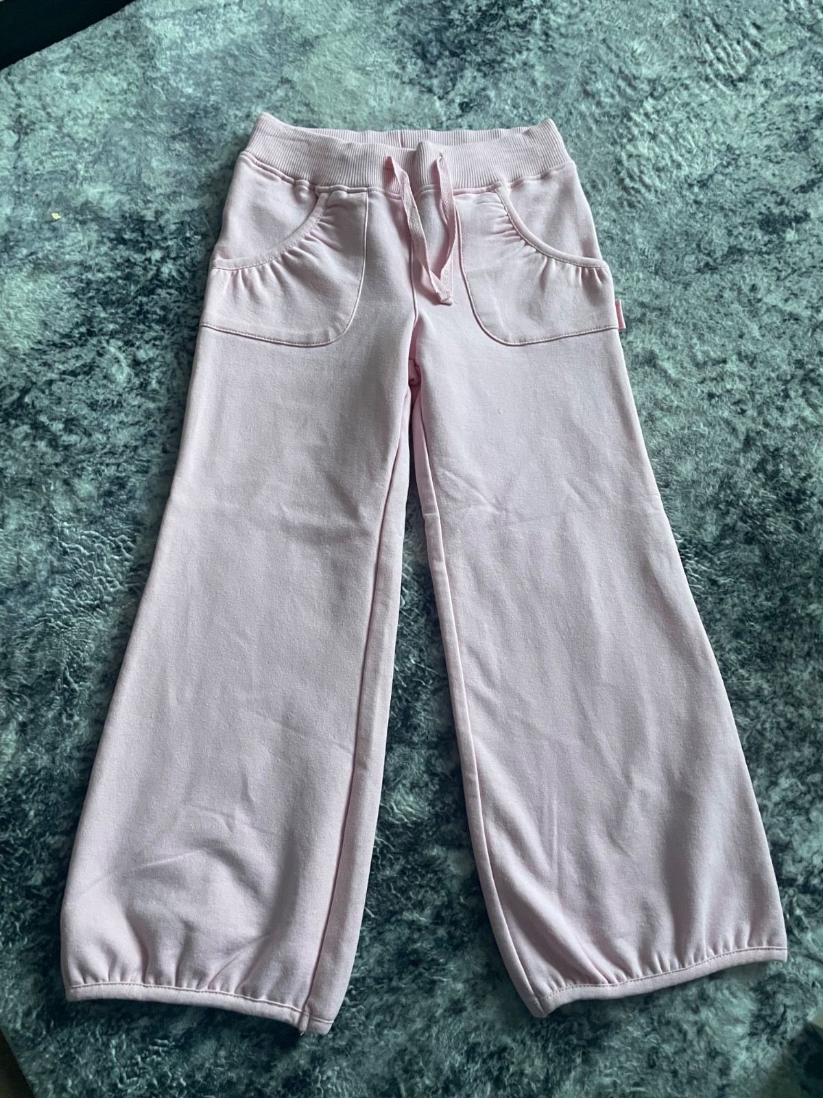 Teplaky v super stave, akurat maju zasitu na stehne malu dierku. Snurka v pase je funkcna. Dlzka: 65 cm