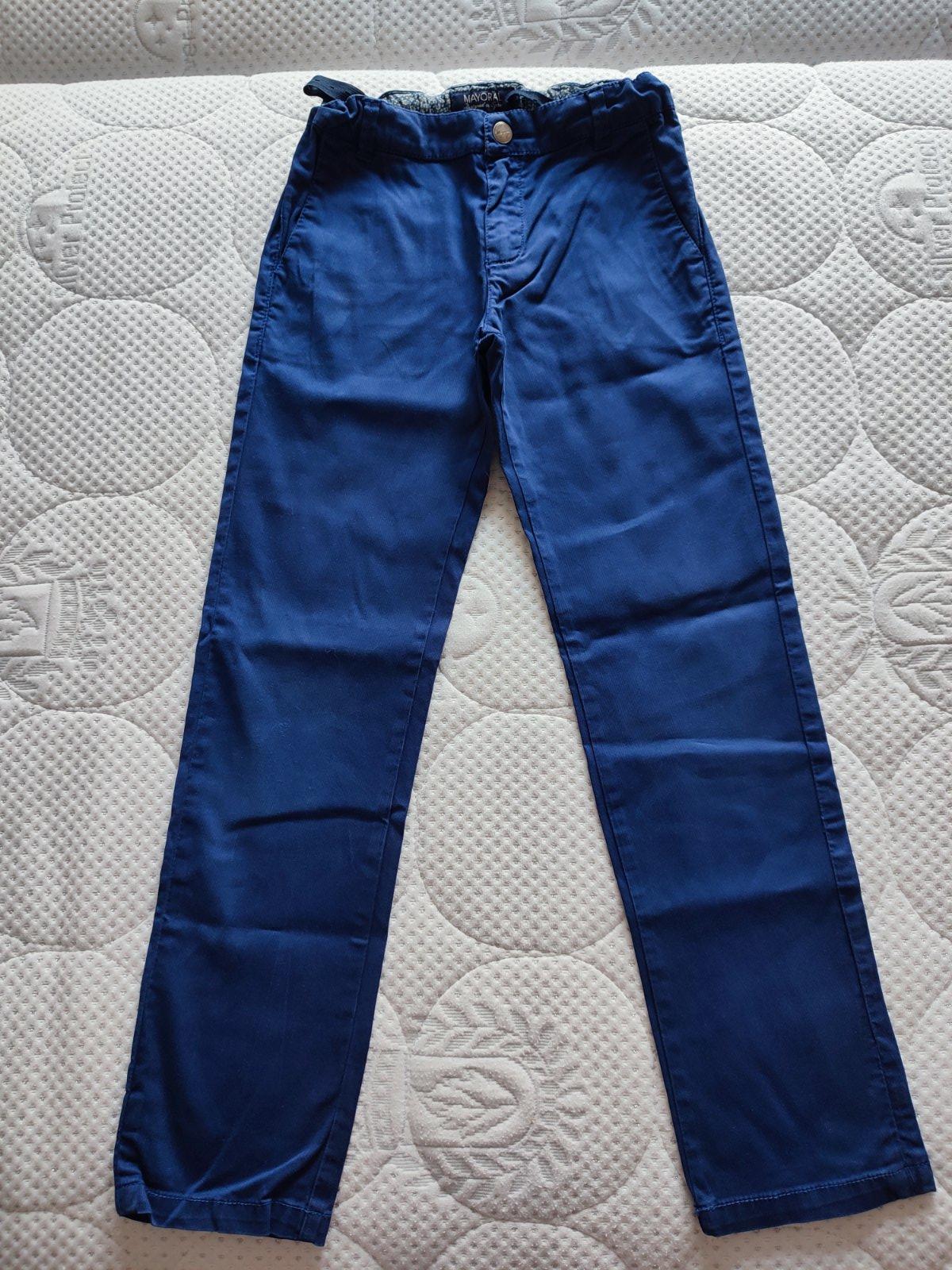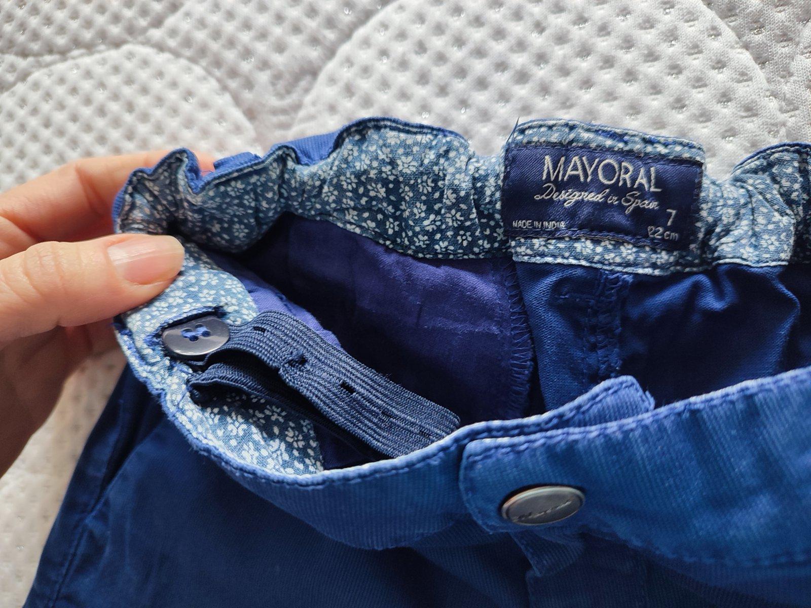 Nohavice zn. Mayoral bez akéhokoľvek poškodenia, elastický pás, zapínanie na gombík, 5 vreciek. Zloženie: 98 % bavlna, 2 % elastan. Veľkosť: 122 (7 rokov).