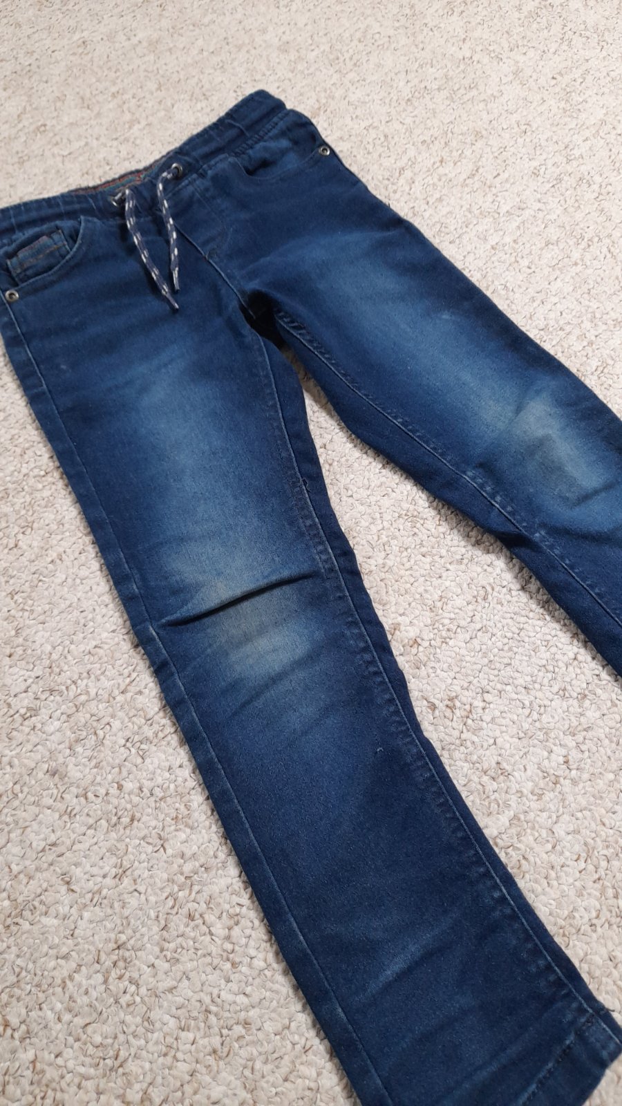 Pekné rifle, pás sa dá regulovať gumičkou, na kolene bola malá dierka tak trosku zašité