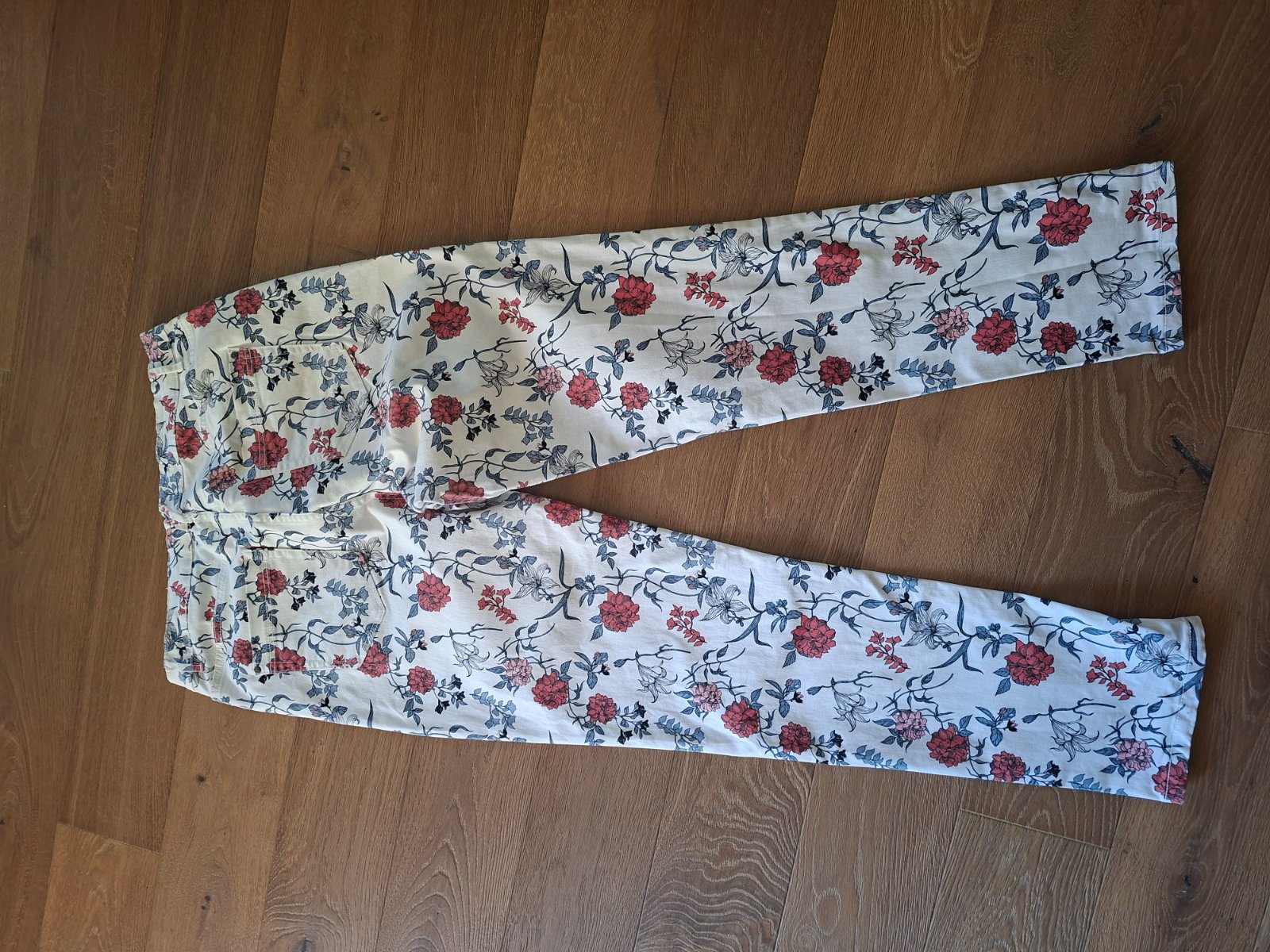 Rifle su nove, velkost nesadla a nestihli sme ich vratit vcas. Rifla su mierne elasticke. Rozmery v nenatiahnutom stave: sirka v pase 2x 38 cm, sirka v bokoch 2x 46 cm, dlzka vonkajsej nohavice 106...