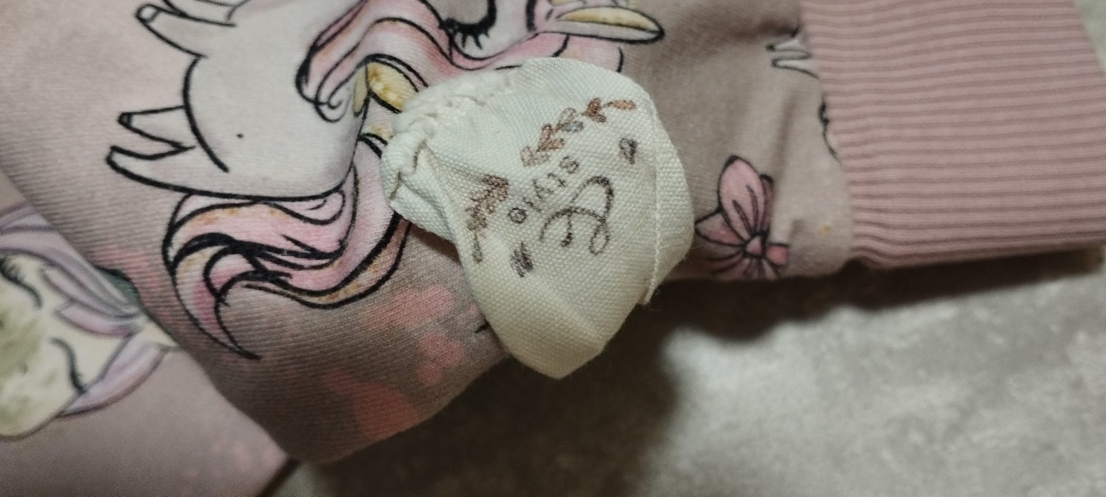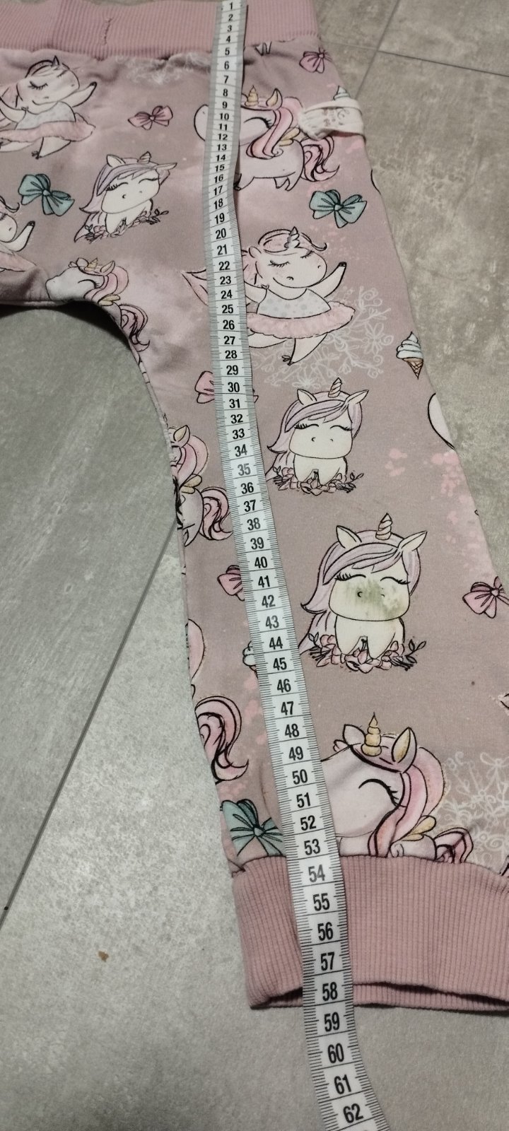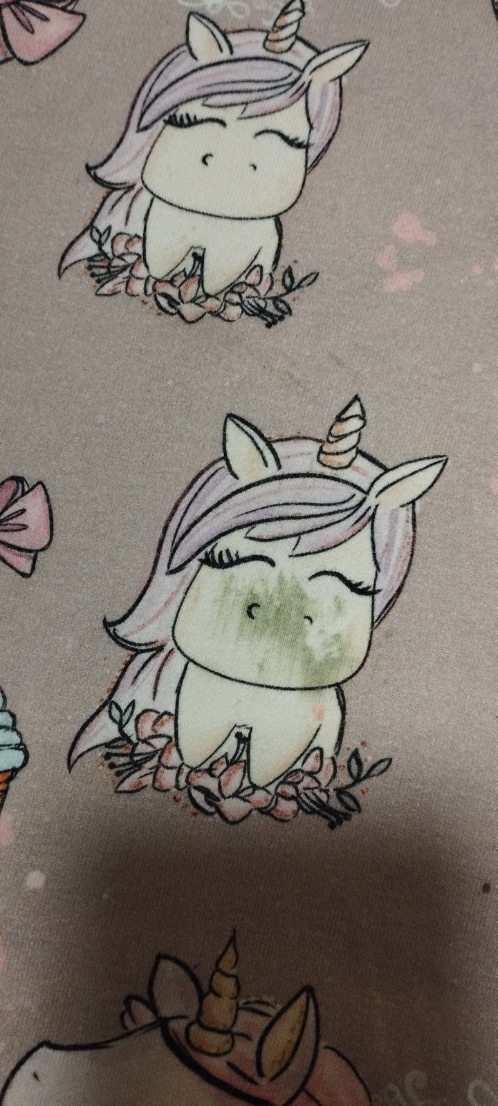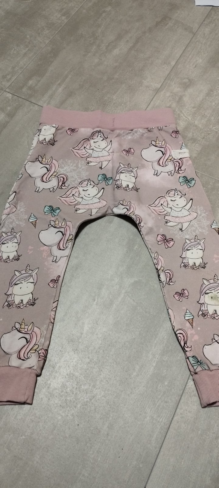 Krásne handmade tepláky. Širšie v páse ( viď foto) zachovalé, ale pod kolenom na hlave jednorožca fľak od trávy a v zadu na zadočku malý fľak od fixky, inak bez poškodenia. Nevidno to veľmi. Ja som neskúšala špeciálne čistiť.