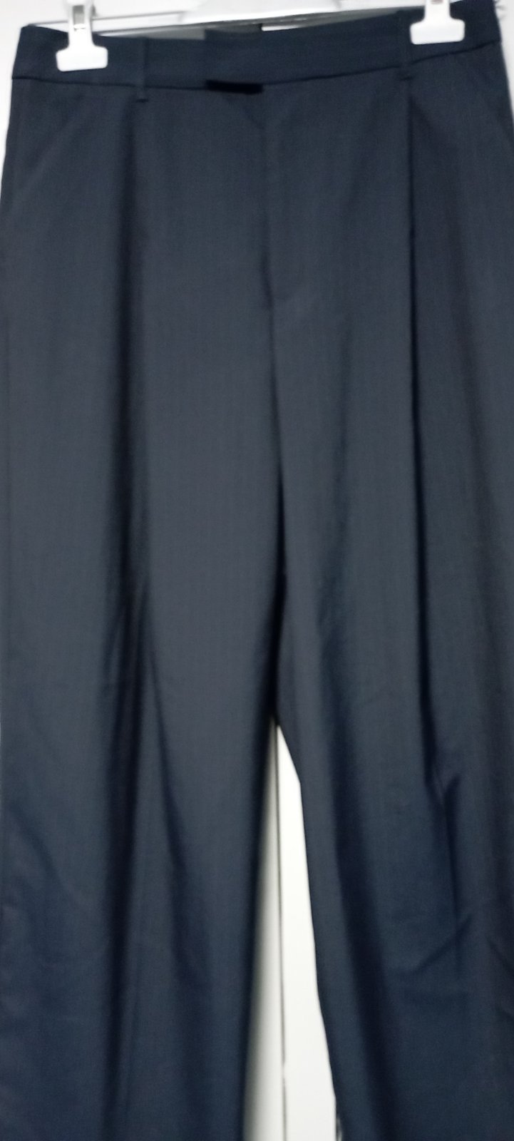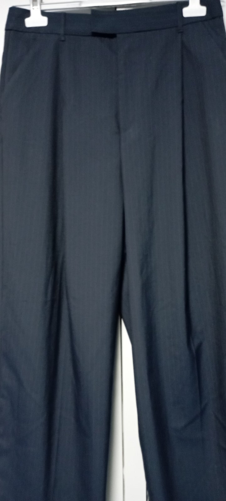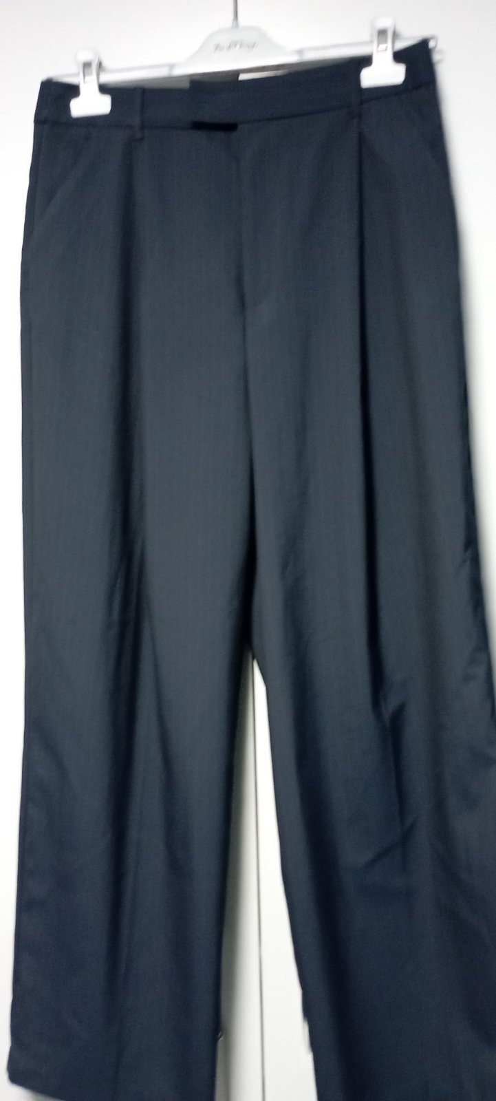 nohavice namornickej tmavomodrej farby s jemnými prúžkami, s vysokým pásom, záševkami, predné vrecká., široký strih nohavíc., zapínanie vpredu na zips, vnútorný gombík a skryté háčiky.v bezchybnou stave