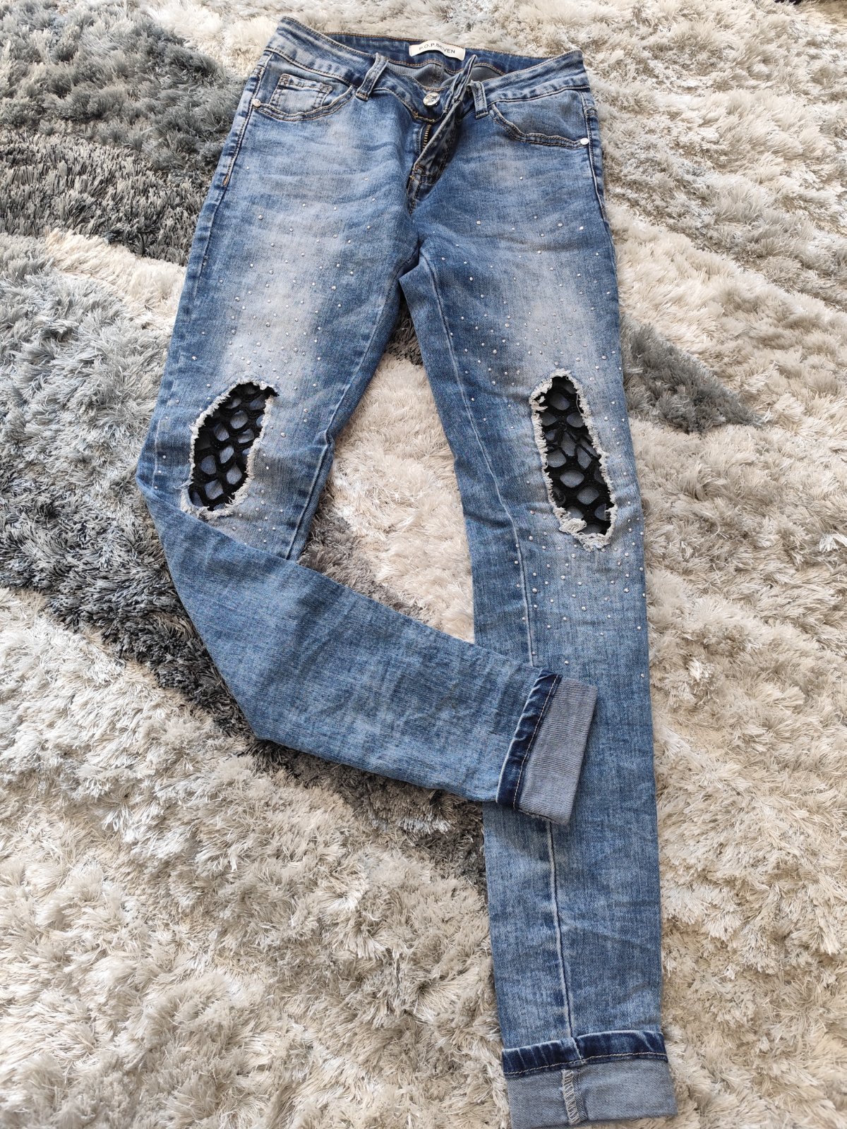 pohodlné elastické rifle z tenšej rifloviny, uv. veľ. XS, rozmery a=89cm b= 70cm, c= od37do44cm, natiahnu sa podľa potreby, veľmi dobrý nosený stav bez poškodení.