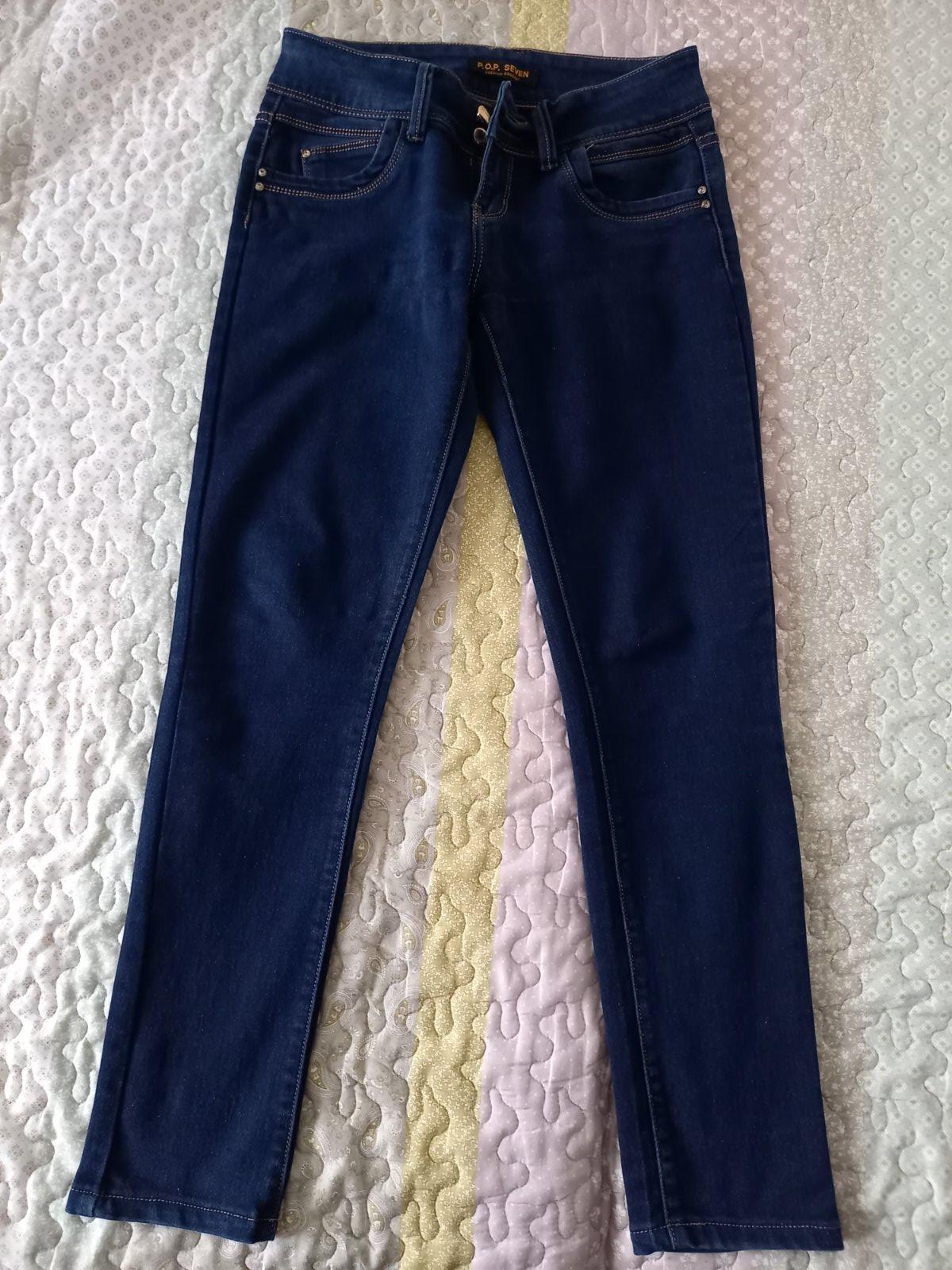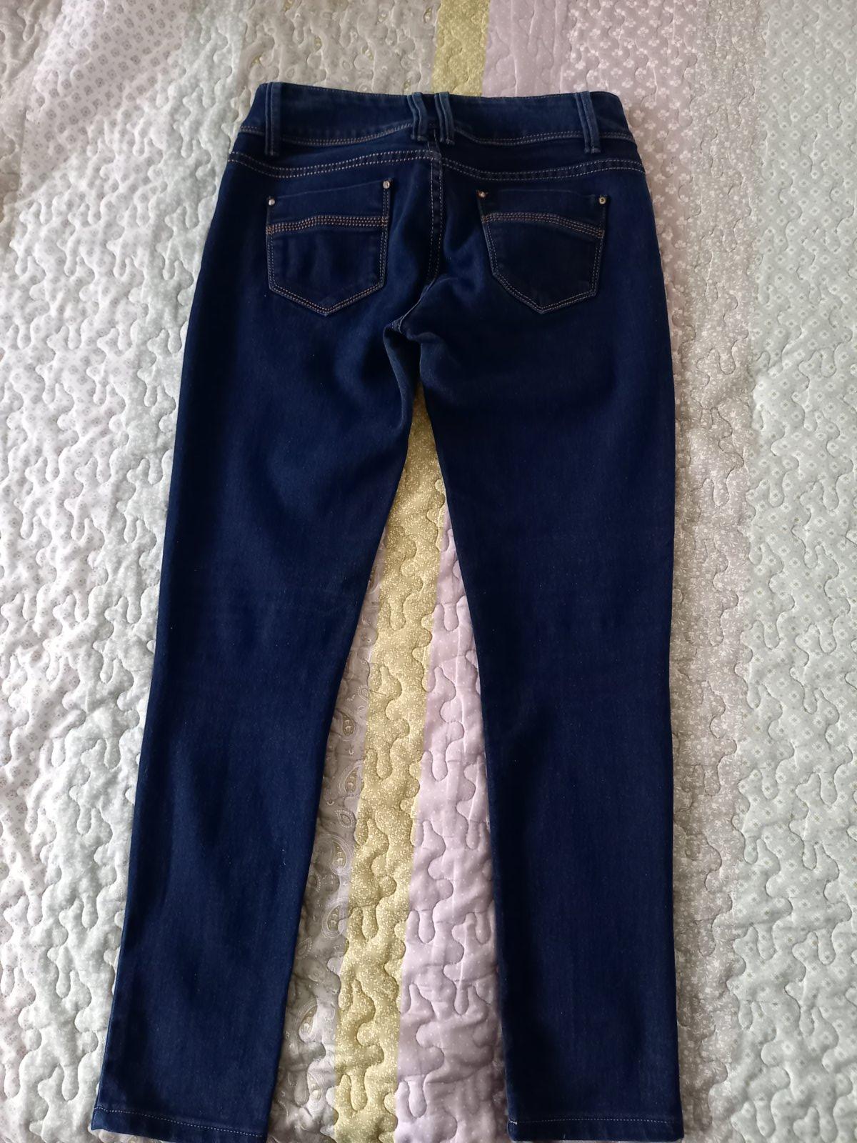 1 krat oblečene rifle, 85%bavlna 15% spandex, elastické, odpadáva gombik, bude tam treba nabiť nový, číslo písane 28. Širka pasa 37 natiahne sa na 40cm. predný /zadný sed je 23/35cm, bočna dlžka 10...