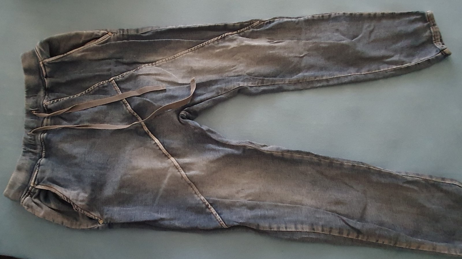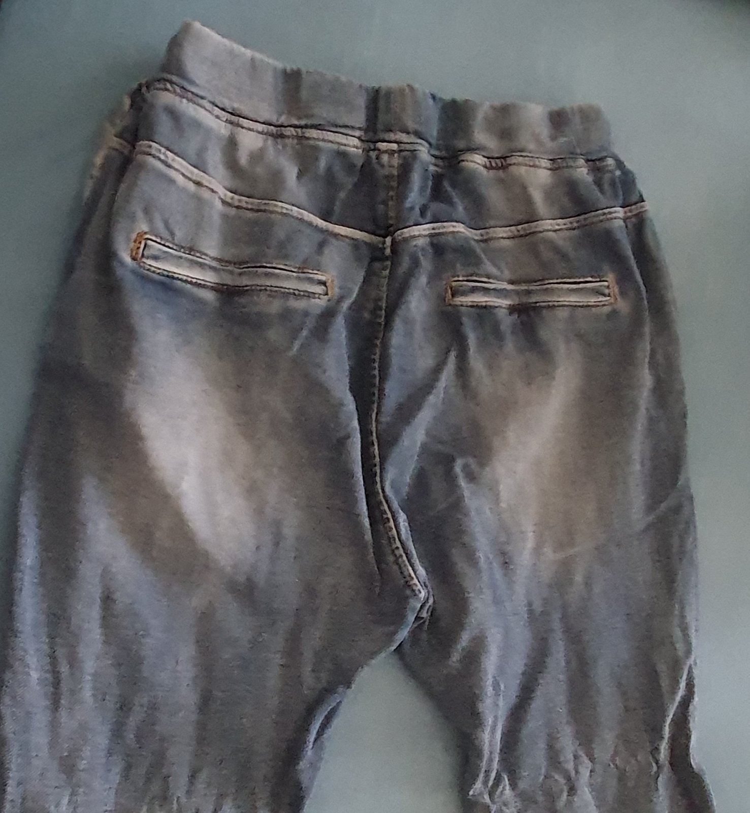 Elastické tepláky s nízkym pudlom. Imitácia pranej rifloviny. V páse na gumu a šnúrku. Zadné vrecká sú falošné. Veľkosť M-L. Nosené,ale stále pekné. Vhodné aj pre bacuľky.