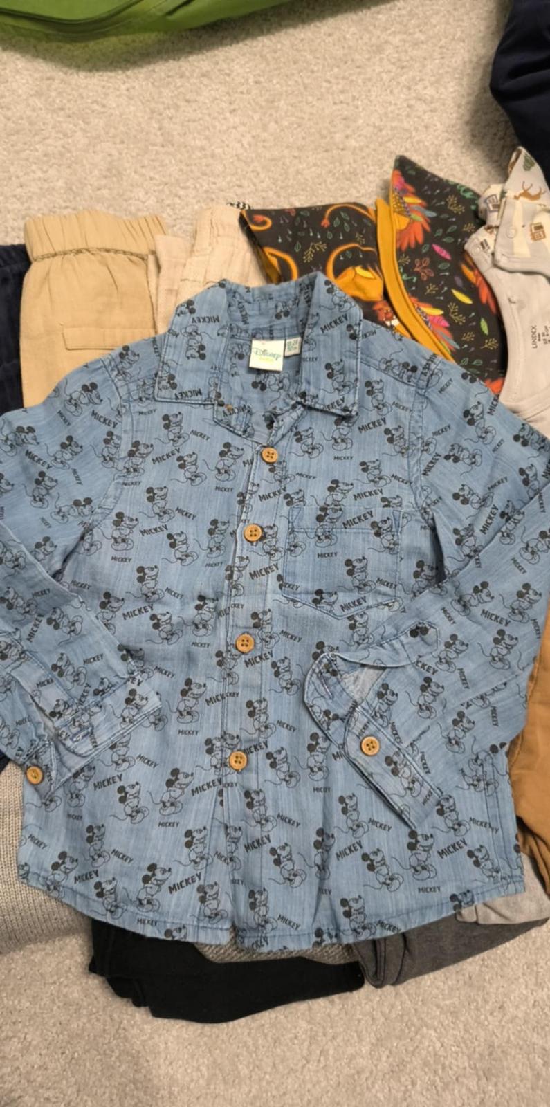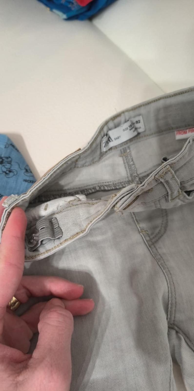 Rifle Zara pre úzkeho chlapca, regulácia v páse, kolienka mierne sfarbené, nie je to vidno keď sú oblečené, zohľadnené v cene - 4€, Riflova košeľa veľkosť 92 - 4€