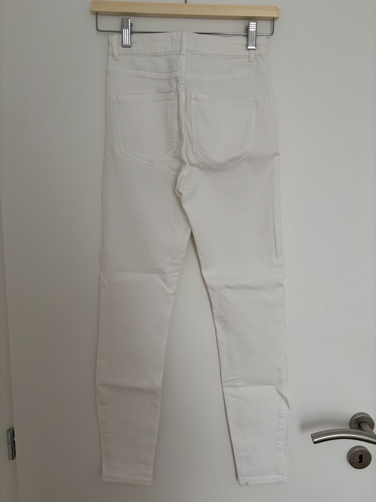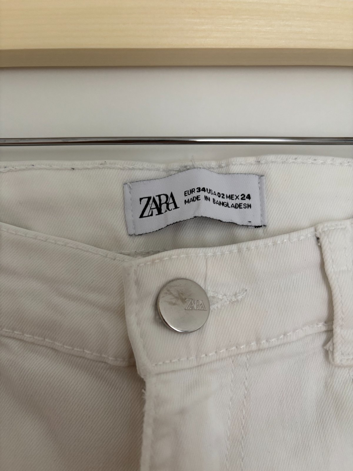 Biele obtiahnuté rifľové nohavice značky Zara s vysokým pásom, veľkosť 34. Nohavice majú na spodku jednej nohavice menší fliačik a mierne poškriabaný gombík (viď fotky). Inak sú bez poškodení a známok nosenia. Osobný odber je možný v BA a NR.