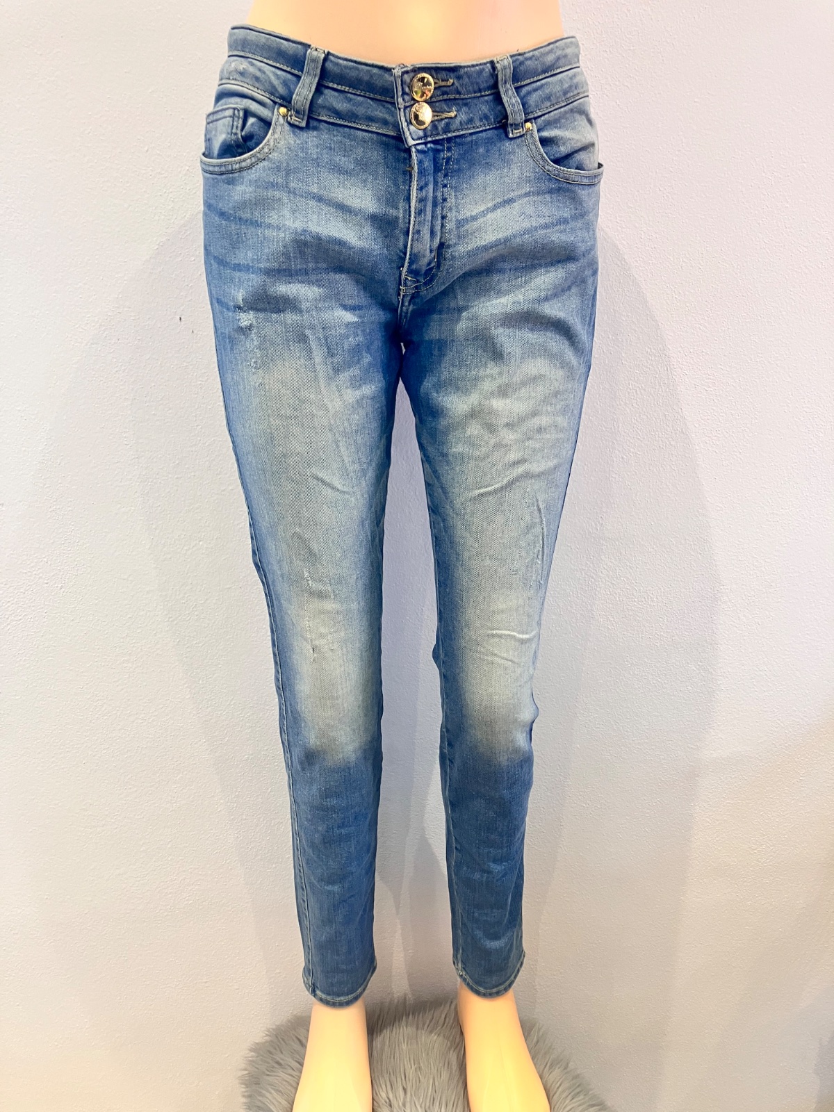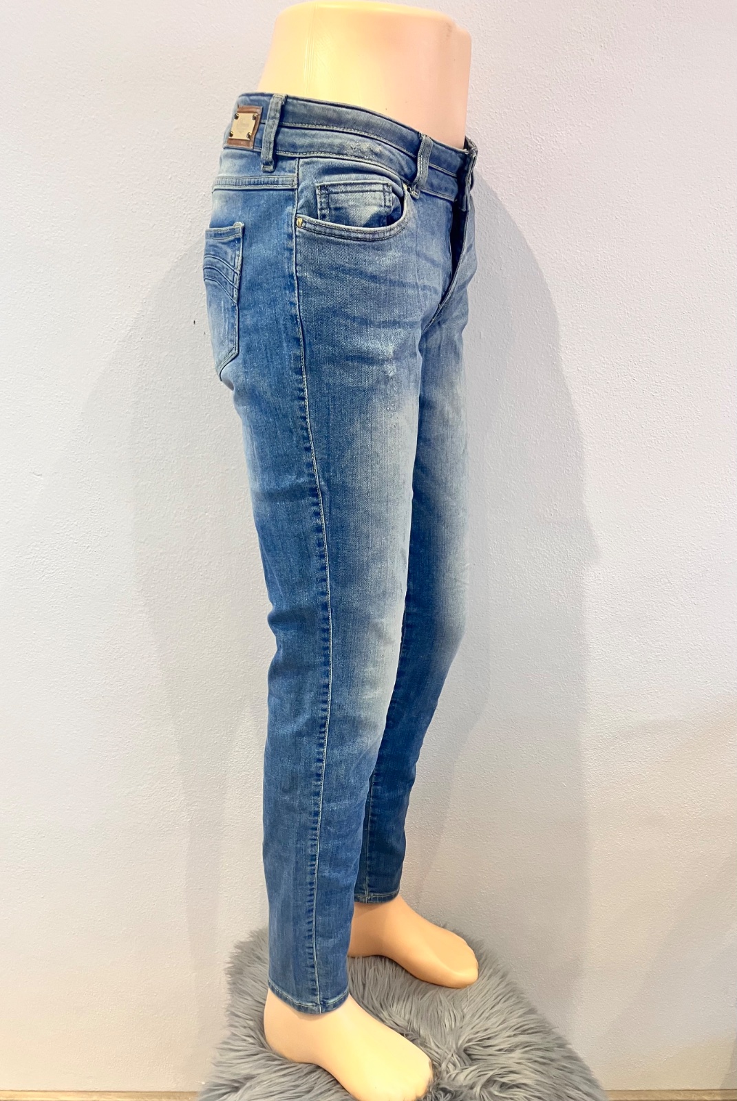 Dámske rifle s nízkym pásom, elastické, zapínanie na zips a na dve gombíky, dve predné a dve zadné vrecká, pútka na opasok, materiál 95%bavlna 5%elastan, veľkosť 40.