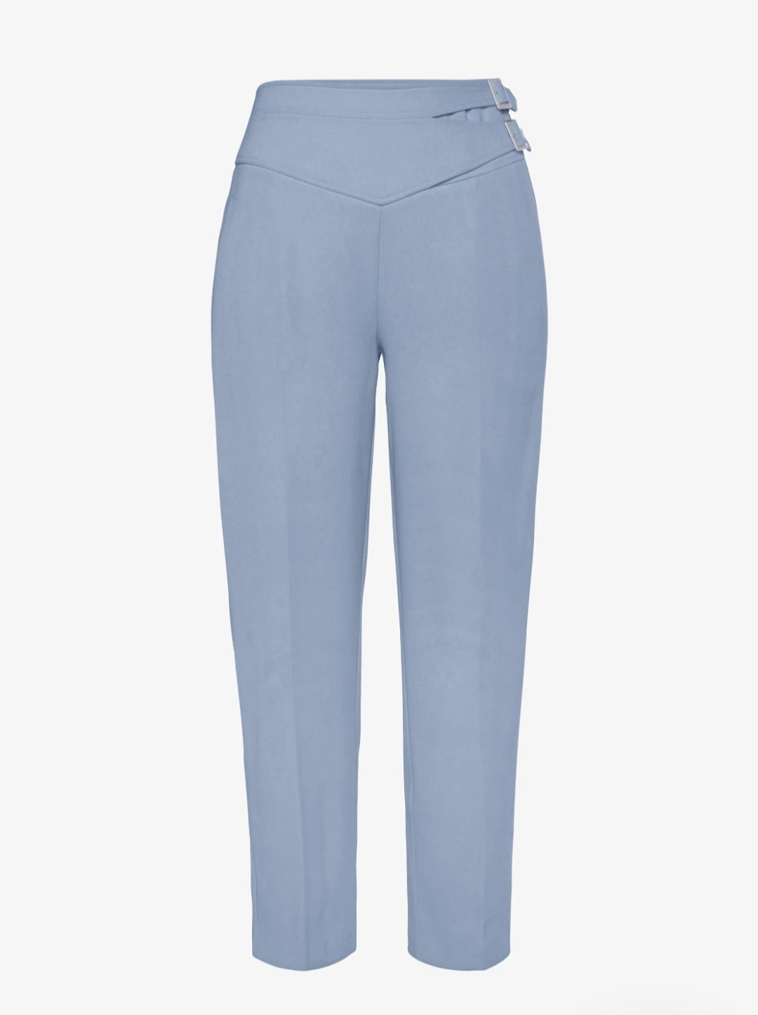 Tieto nohavice majú vysoký pás a strih, ktorý skvelo sedí na postave. Vpredu na páse sú dve strieborné pracky, ktoré im dodávajú štýlový a originálny vzhľad. Vďaka zipsu na boku je ich obliekanie veľmi pohodlné. Na prednej strane majú aj praktické bočné vrecká.