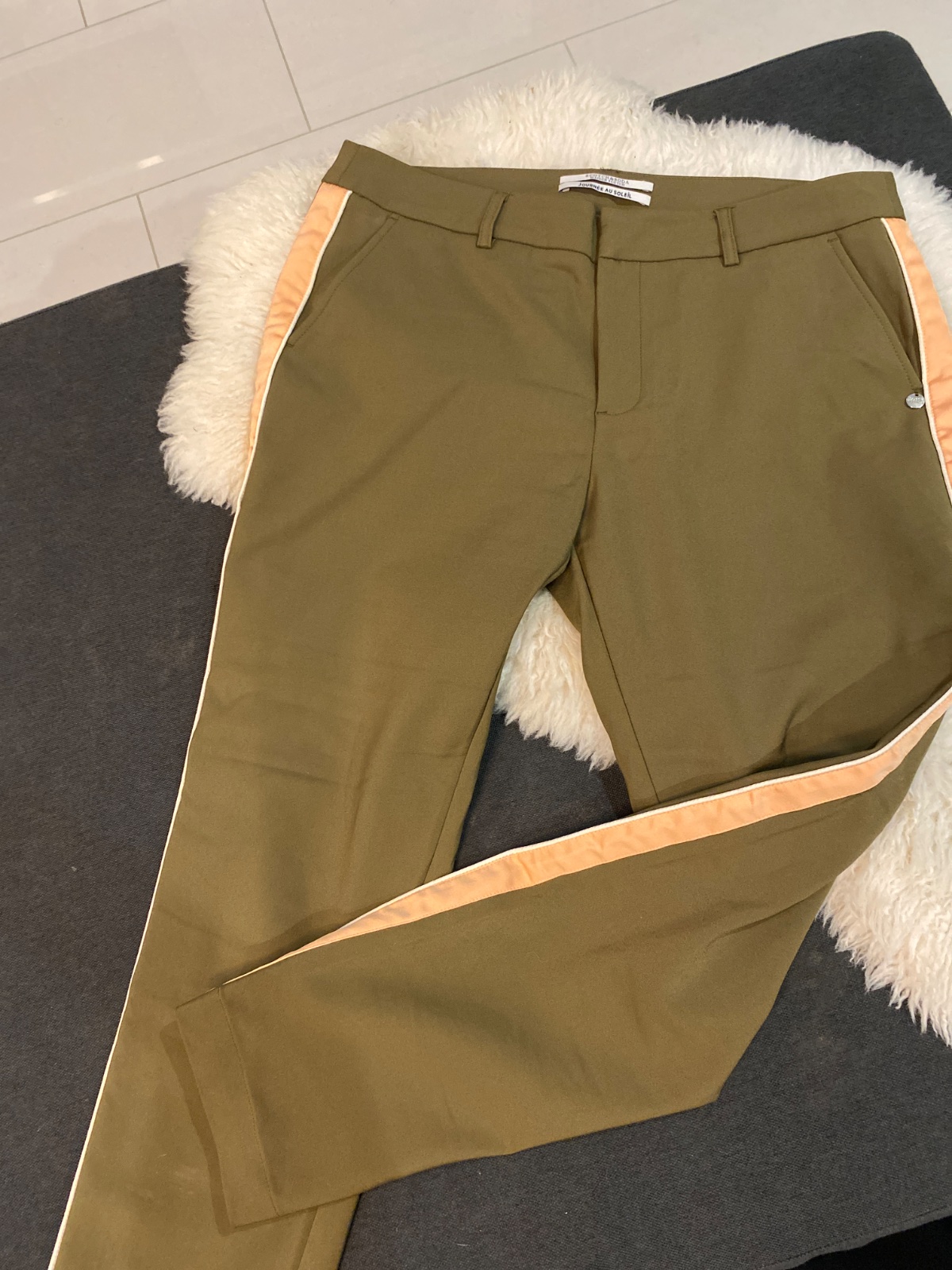 Príjemné olivové kapsáče na spodu do gumy. V páse guma a šnúrka. Veľkosť 38. Dĺžka 89 cm a pás 33 cm.