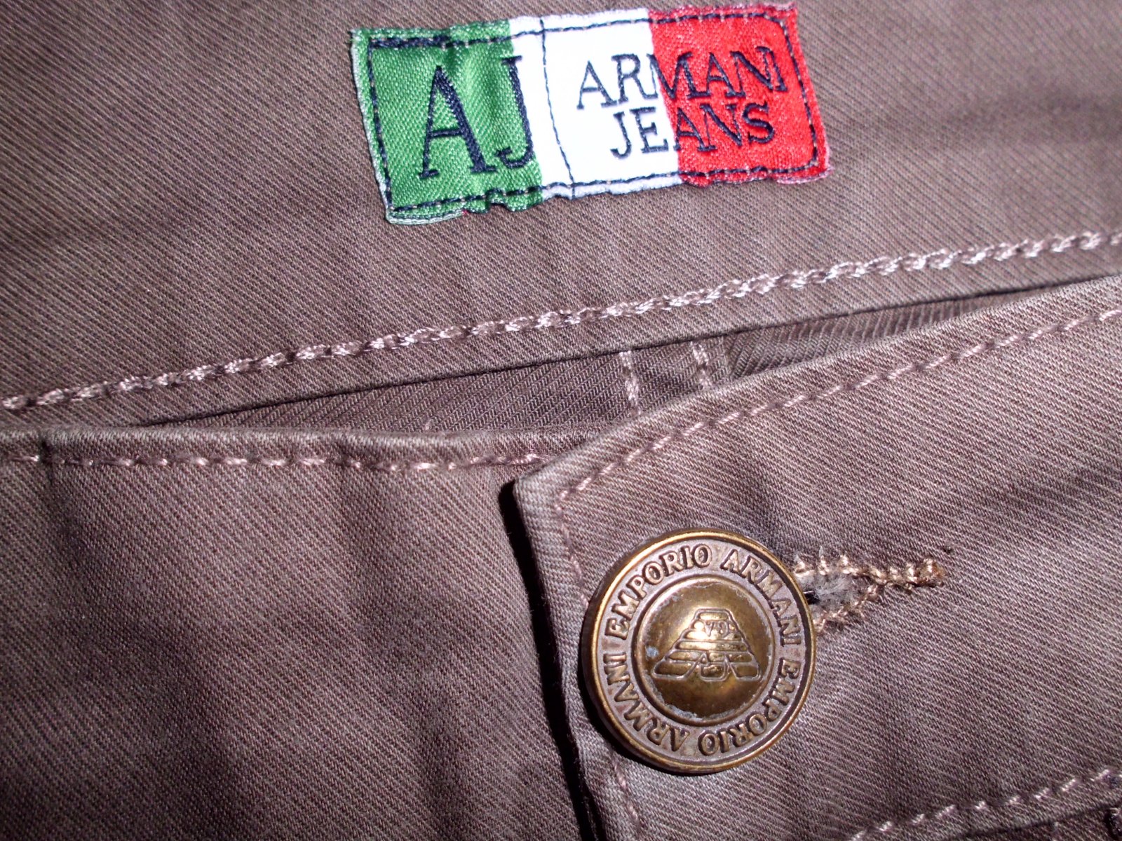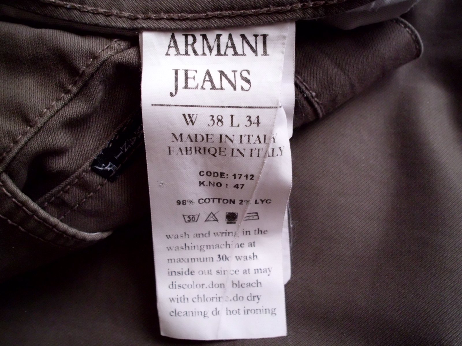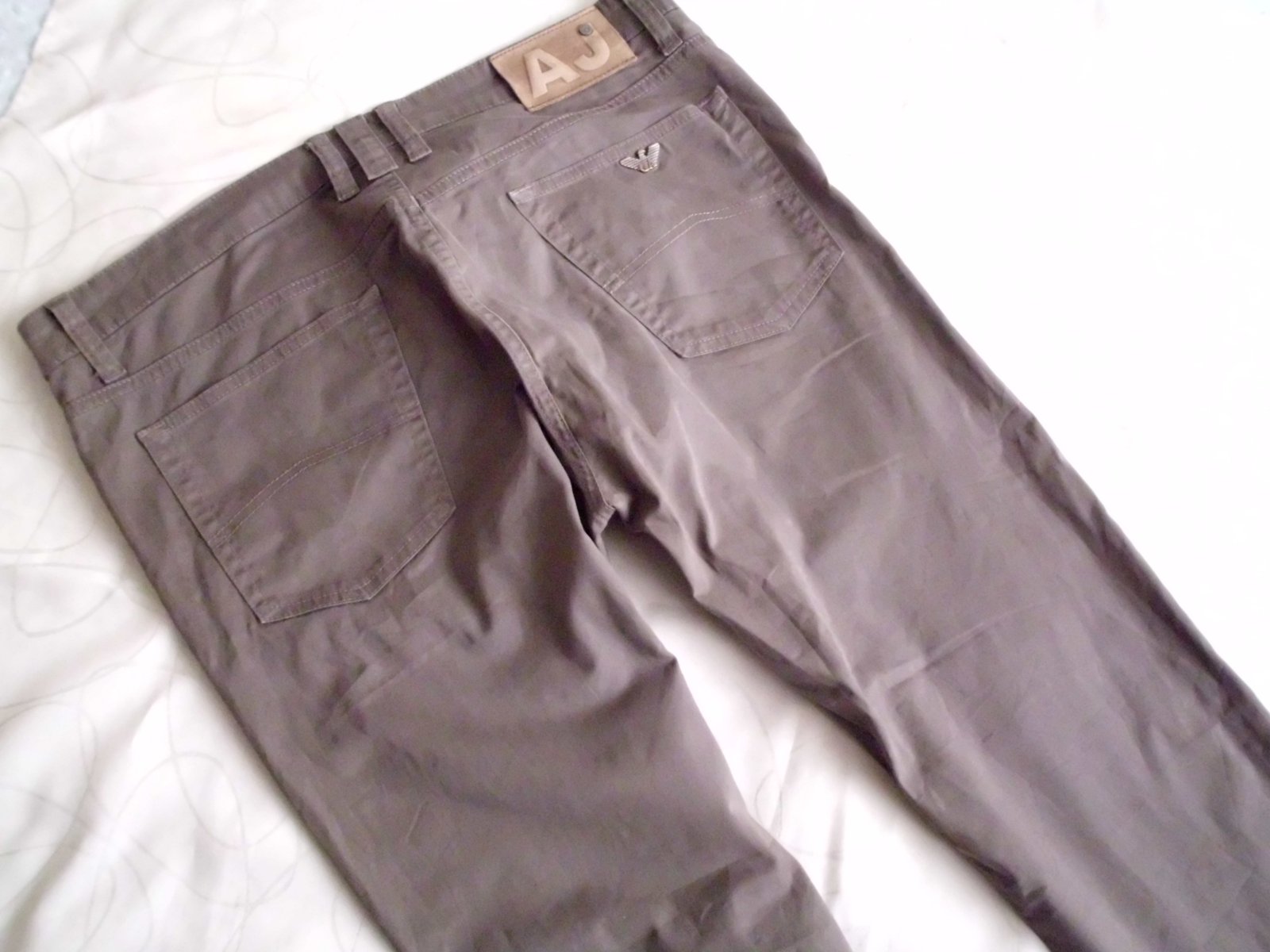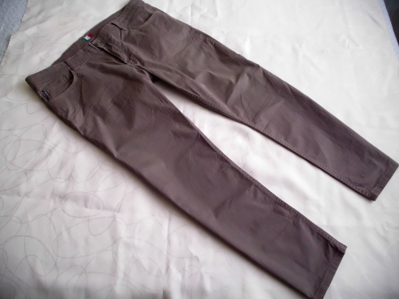 Predám pánske nohavice na spôsob rifiel Armani vel. XL 38/34, pás 52 cm, predný sed 27 cm, zadný 37 cm, stehno 30,5 cm, celková dĺžka 103 cm, spodok 19 cm, 5 vreciek, látka tenšia príjemná 98% bavlna+ 2% lyc., hnedá do siva farba,100% top stav