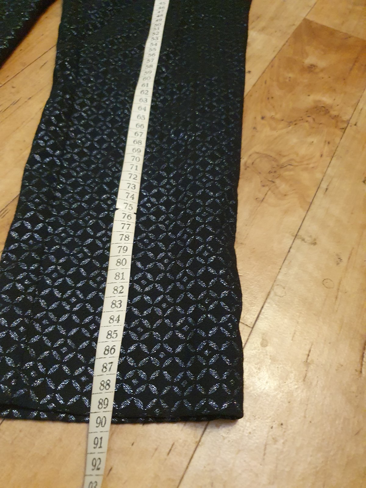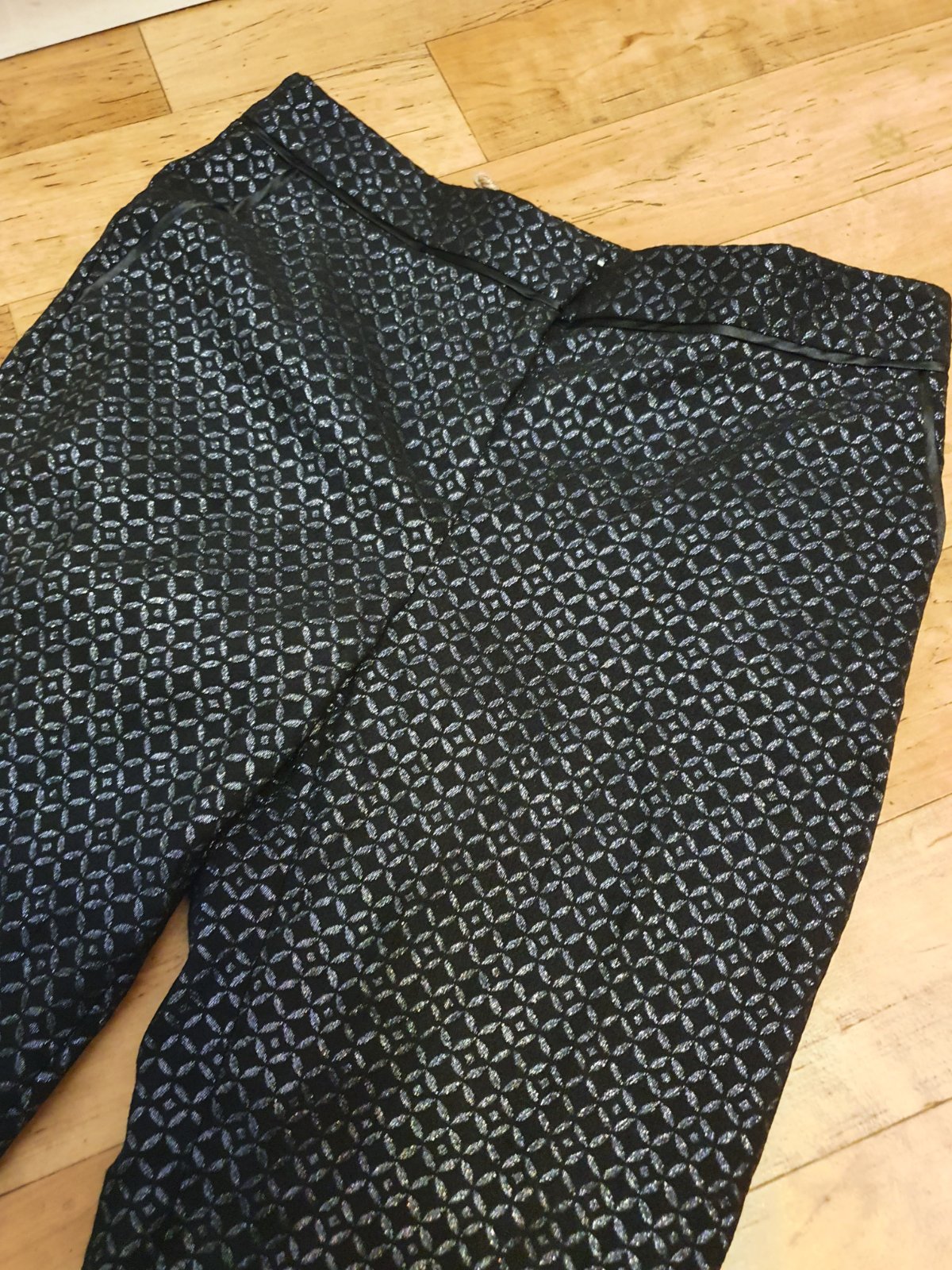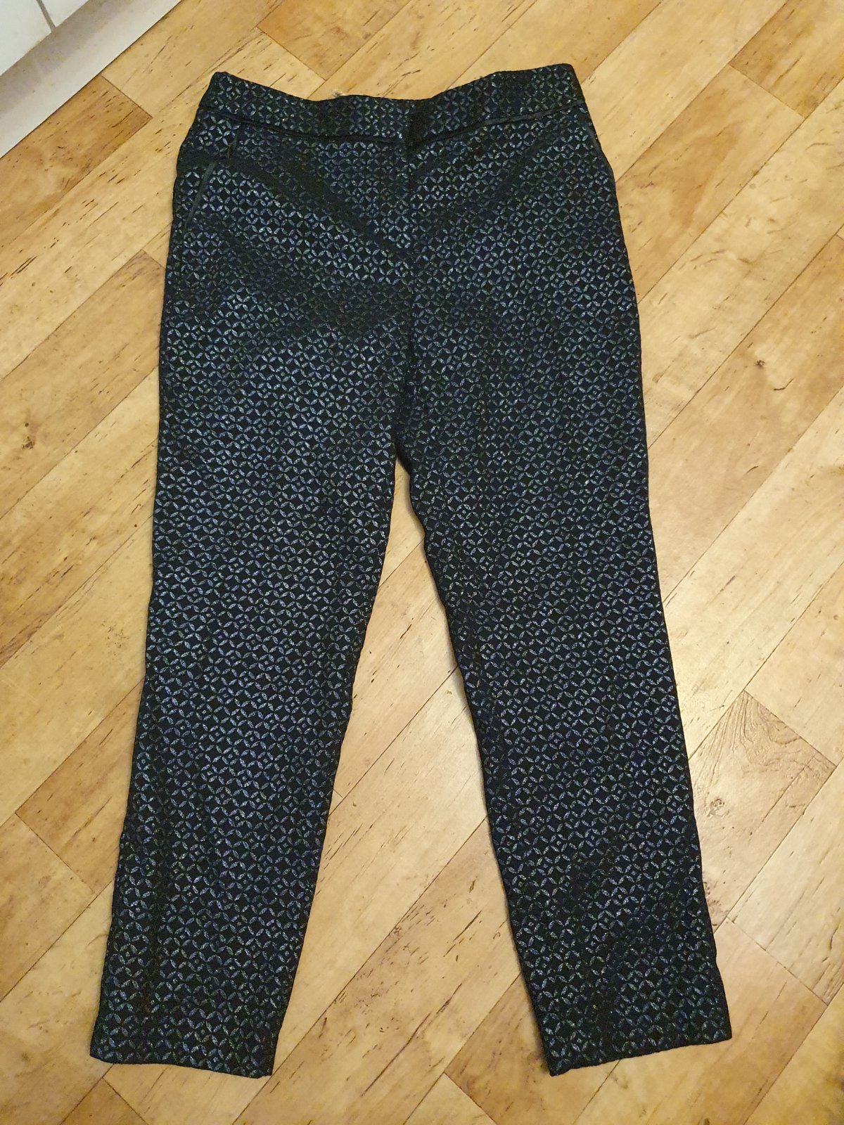 Krásne nohavice s potlačou krajky úzky strih a vrecká v bokoch, sú prekrásne, len odskúšané lebo sú mi voľné na bokoch aj keď sú 36 pokojne by som povedala že skôr 38, rozmery: pás 84cm, boky 92cm,...