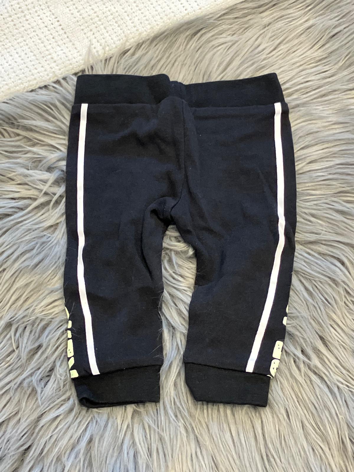Chlapčenské tepláky čierne s neónovo zeleným nápisom a bielym pruhom, elastické. Materiál 100%bavlna.