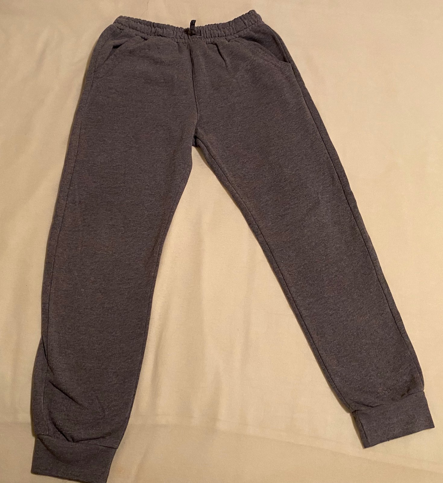 Šedé tepláky na šnúrky v páse. Veľ. na 10-11 rokov, 140-146 cm.