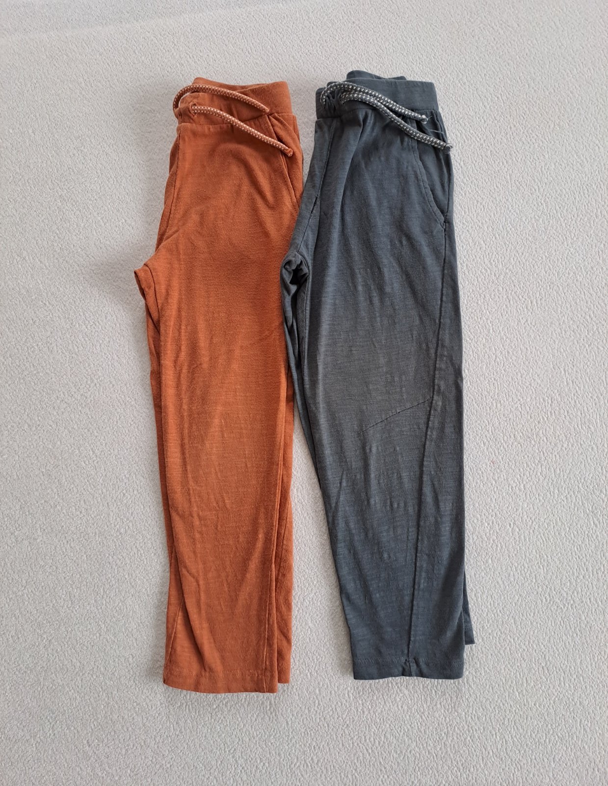 Oranzove / skoricove pekny noseny stav, vel.104. Ocelovomodre mali dierky na kolienkach, boli opravovane u krajcirky; spredu povoleny svik (vid aj foto zvnutra nohavic). Na stitku 110, avsak po oprave sa zmensili na 104, takze ich predavam spolu.