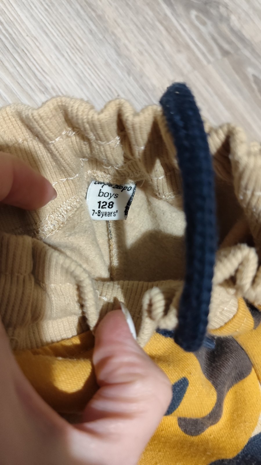 veľmi dobrý stav,akurát na jednej nohavici je pri kolene dierka-viď foto, mäkká bavlna dlžka 69cm,od rozkroku 52cm,pás 23-39cm
