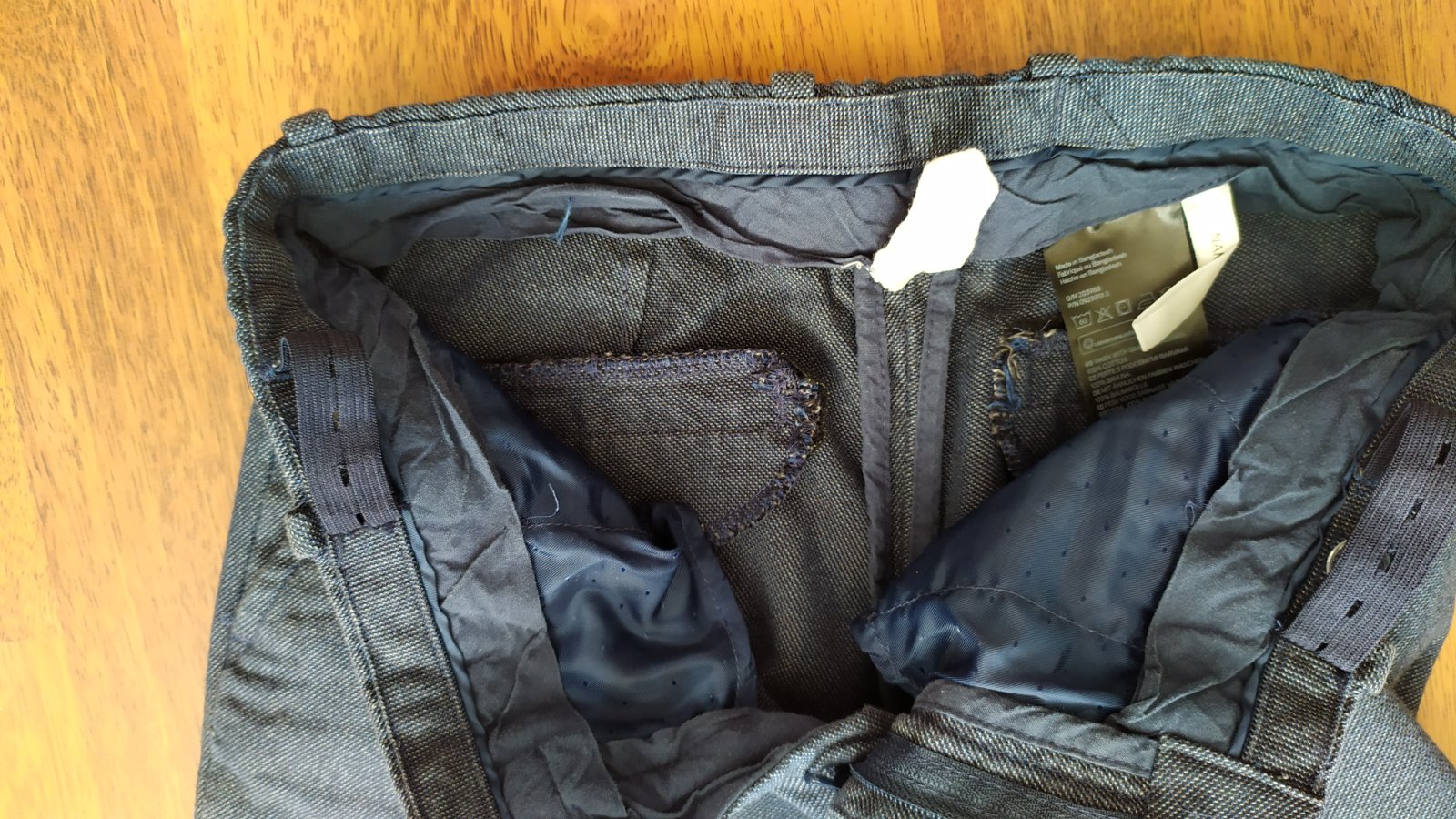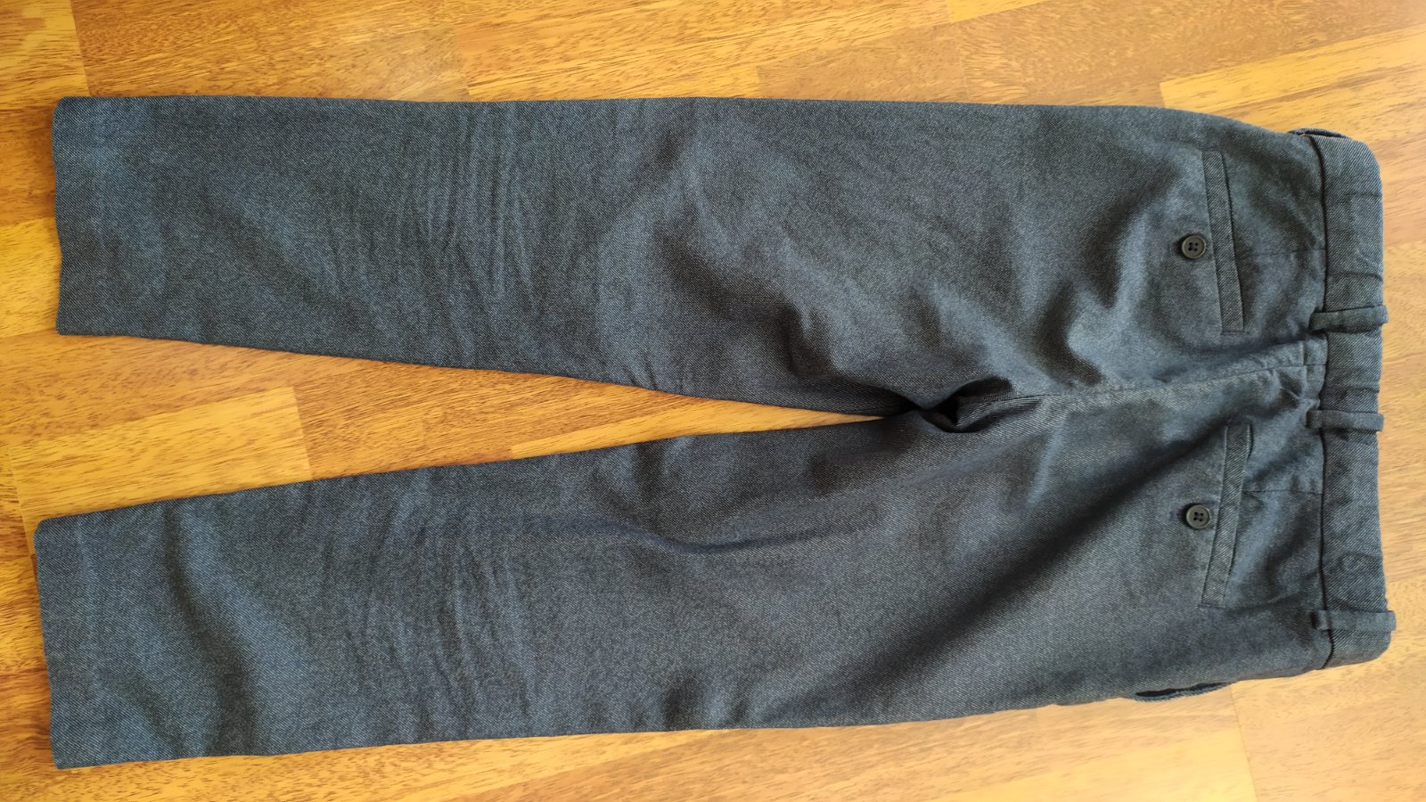 veľmi dobrý stav, nosené príležitostne, š: 33 cm, D: 75,5 cm, v páse nastaviteľné, farba sivomodrá, 100% bavlna, dajú sa zažehliť puky