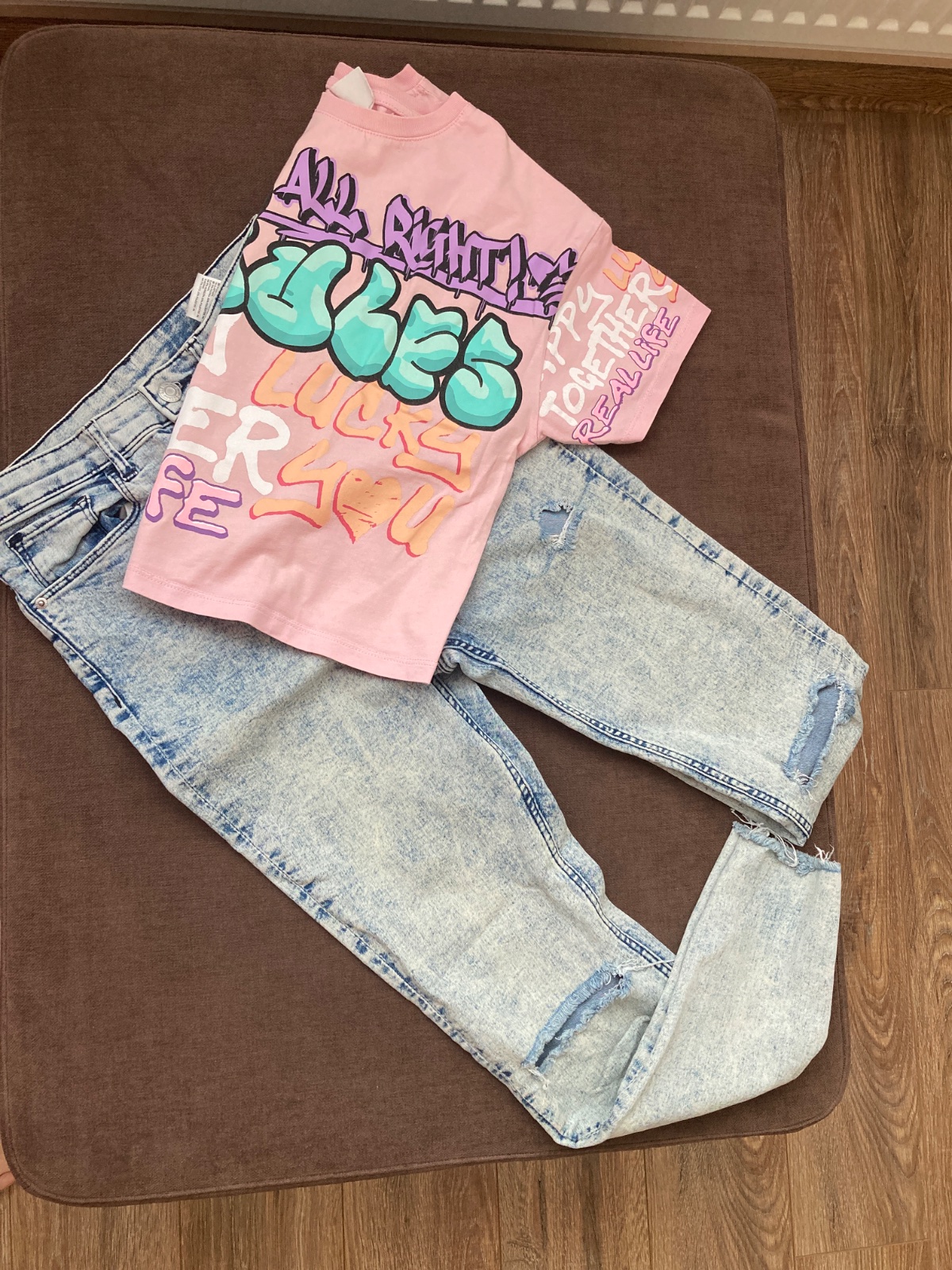 Dievčenské rifle, rozmery: pás 2x34, boky 2x51, dĺžka 99 od pása.