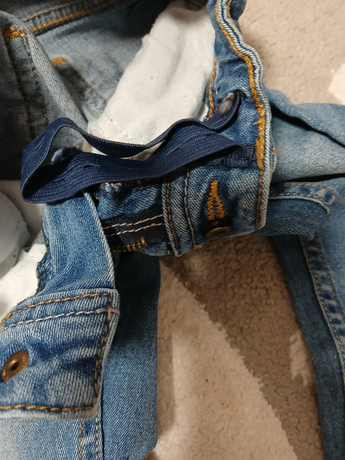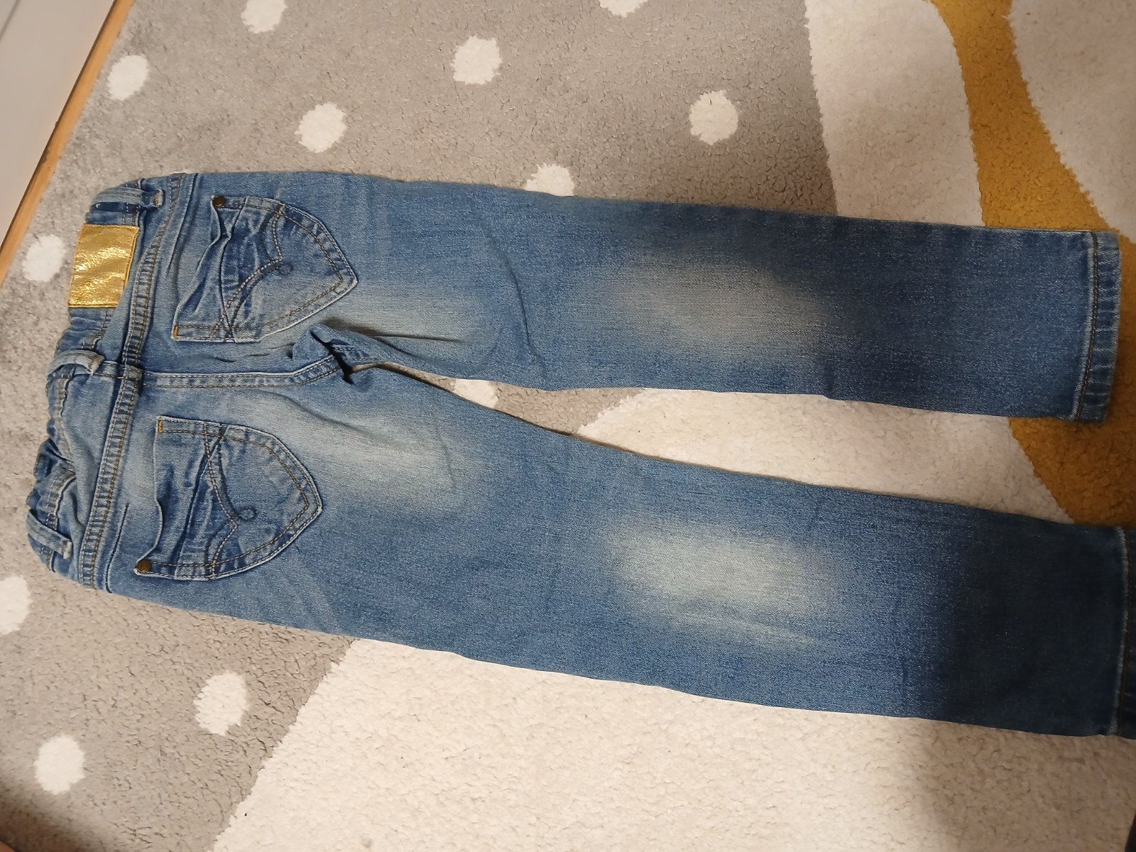 Veľmi zachovalé dievčenské rifle na gumičku v páse aj na spodkoch riflí. Žiadne gombíky ani zips. Vpredu aj vzadu sú 2 vrecká. Rozmery: v páse 27cm, dĺžka 67cm.
