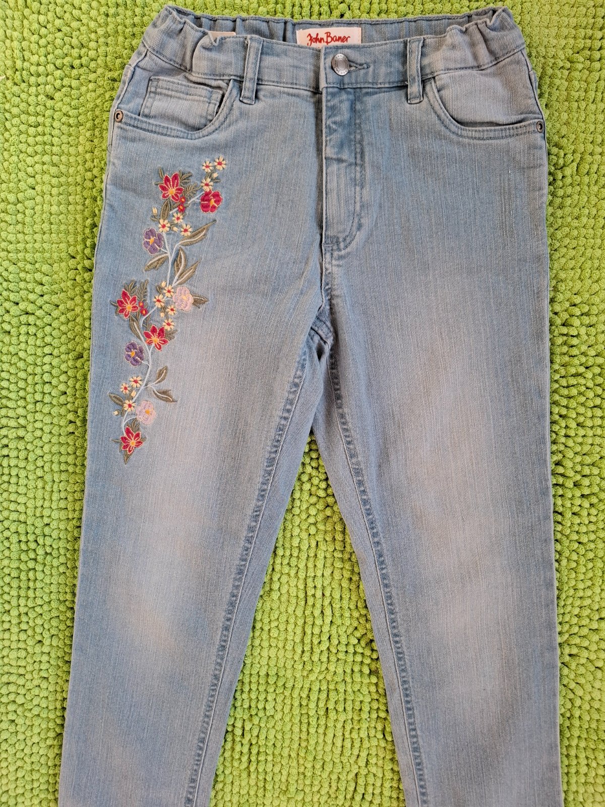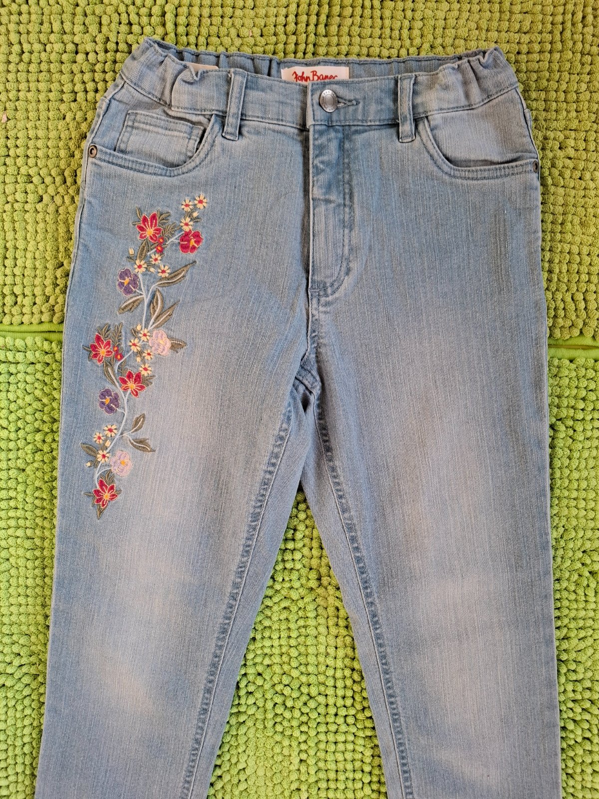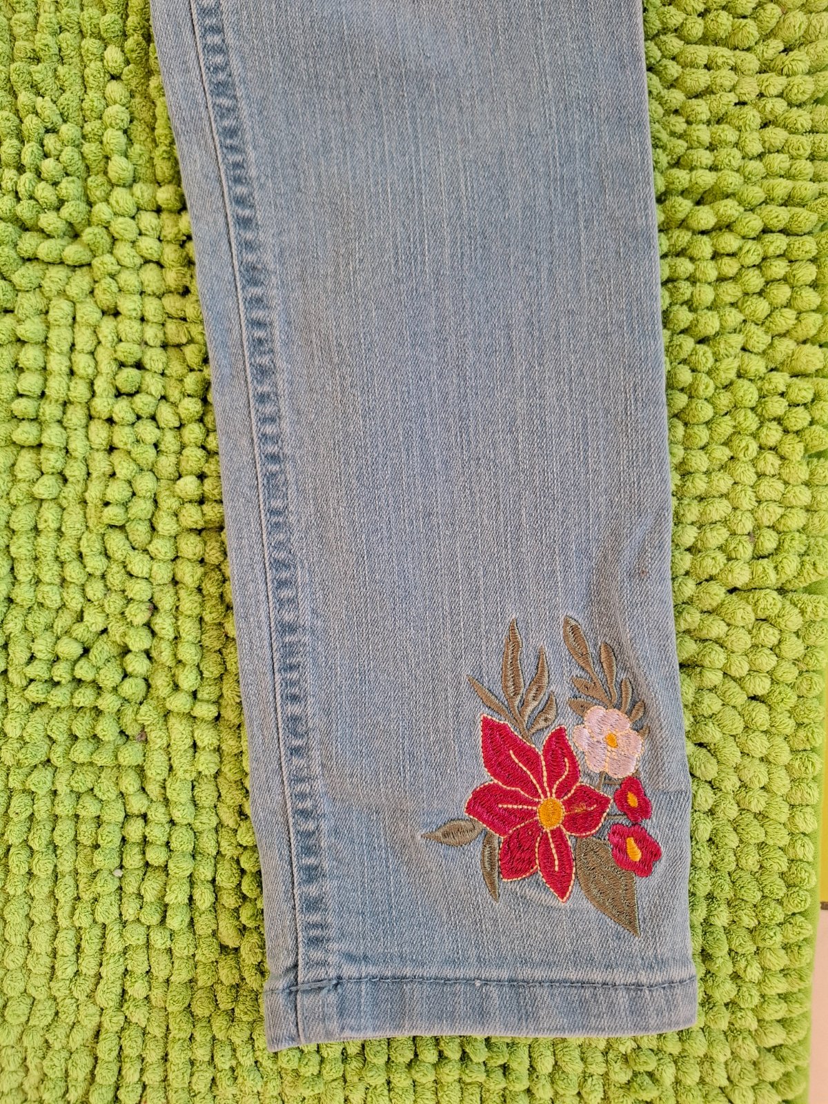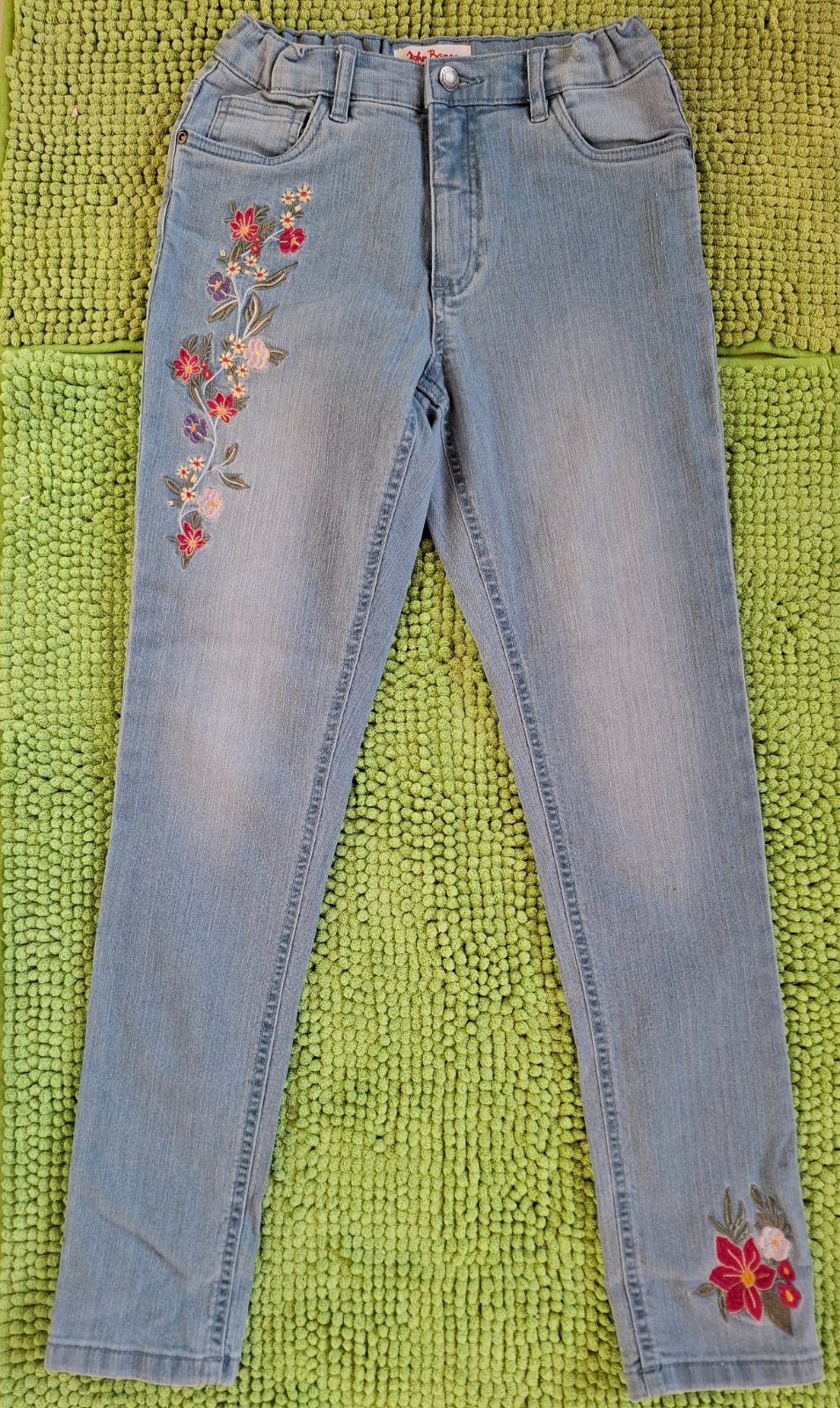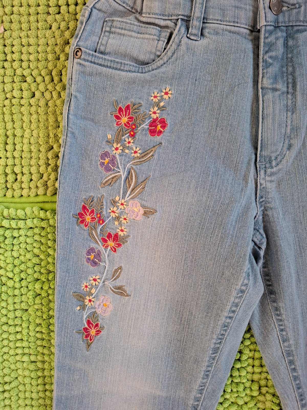 Veľmi pekné, nové rifle s kvetinovou výšivkou. V páse je sťahovacia guma.
