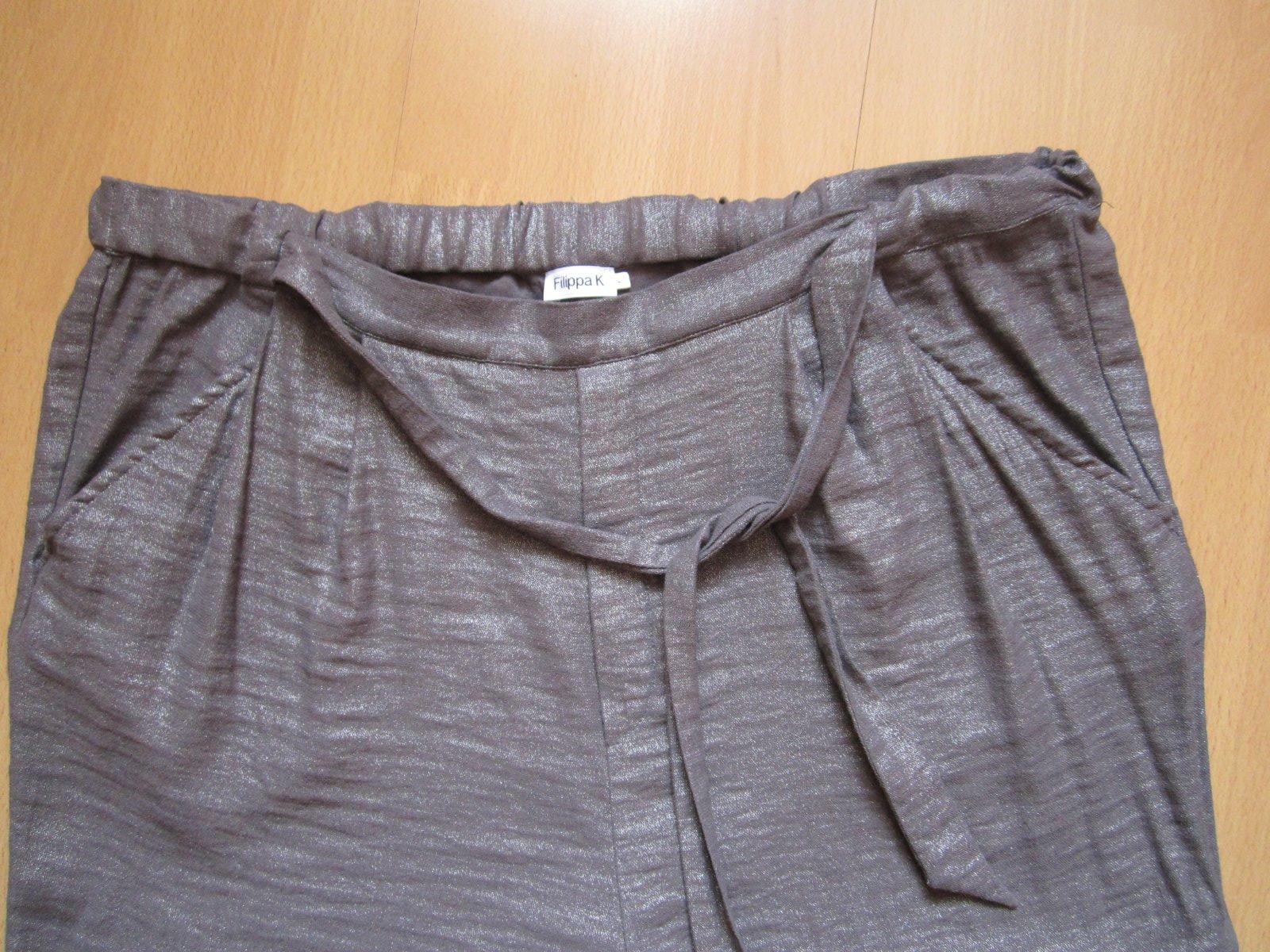 Krásne letné nohavice bez dier či fľakov,,s lesklou niťou ,oblečené 2x,,je do gumičky aj sa viaže,po bokoch má vrecká ,dĺžka-102cm ,boky 2x 60cm,ale sú elastické tak ešte povolí,,pás v kľude 2x 43,5cm,,,79% viscosa,,21%polyamid...........+ pošta