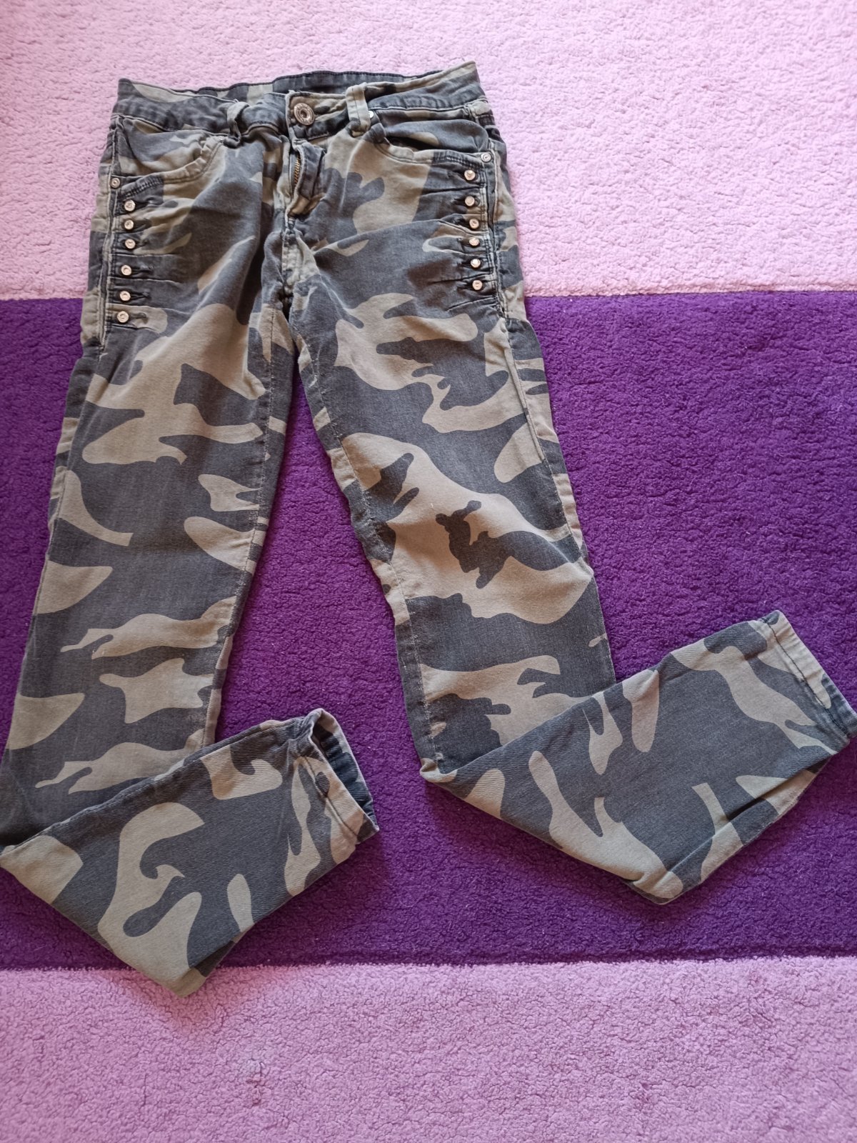 Predám džínsy s kapsacmi na boku a zapínaním na zips na spodu. Žiadne známky nosenia nie sú viditeľné.