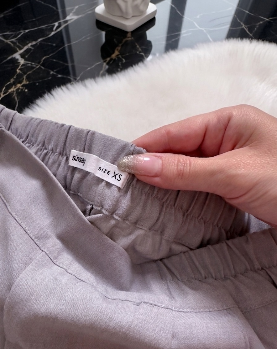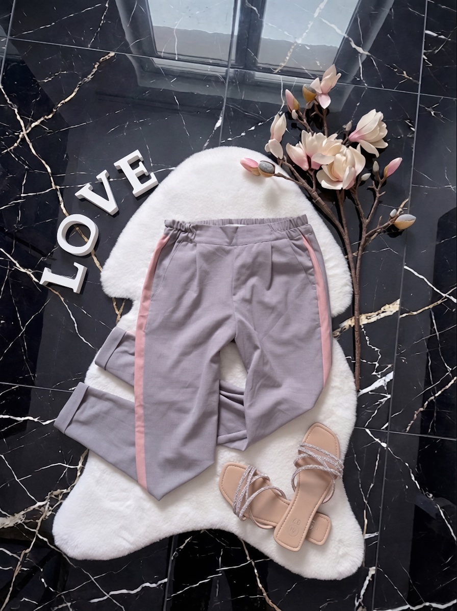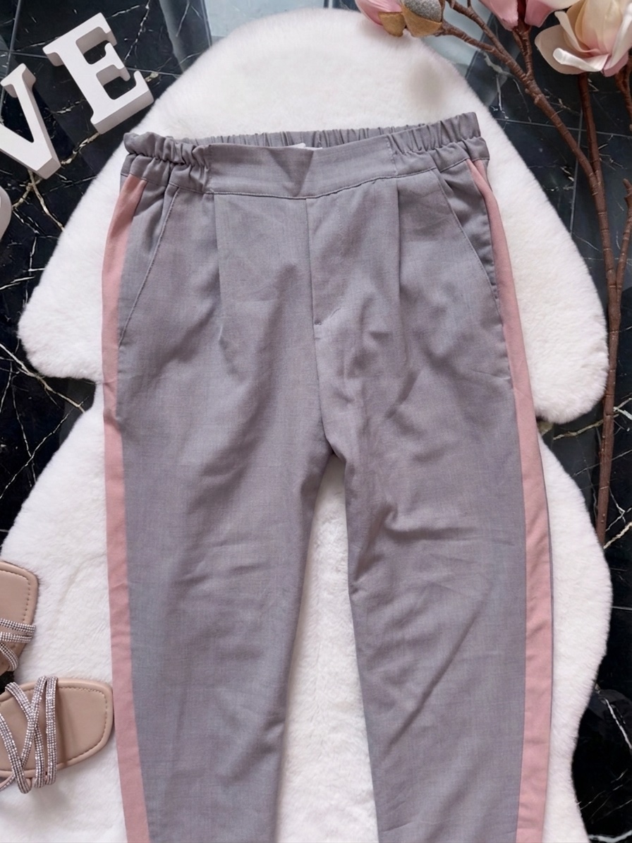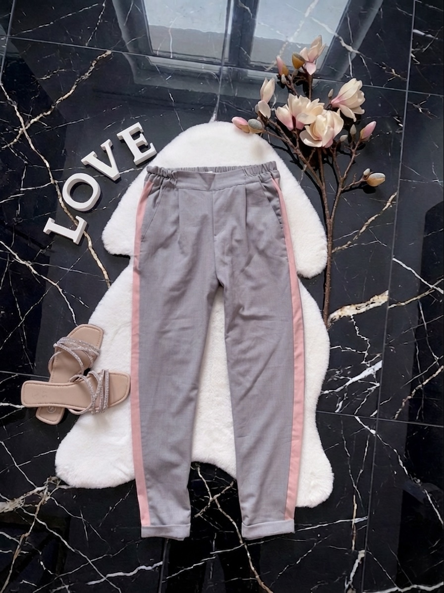 Posuniem elegantné nohavice v svetlošedej farbe s púdrovo ružovým pásikom na boku. Nohavice sú v top stave, pár x vzaté do práce. Sú pohodlné vďaka elastickej gumke v páse.
