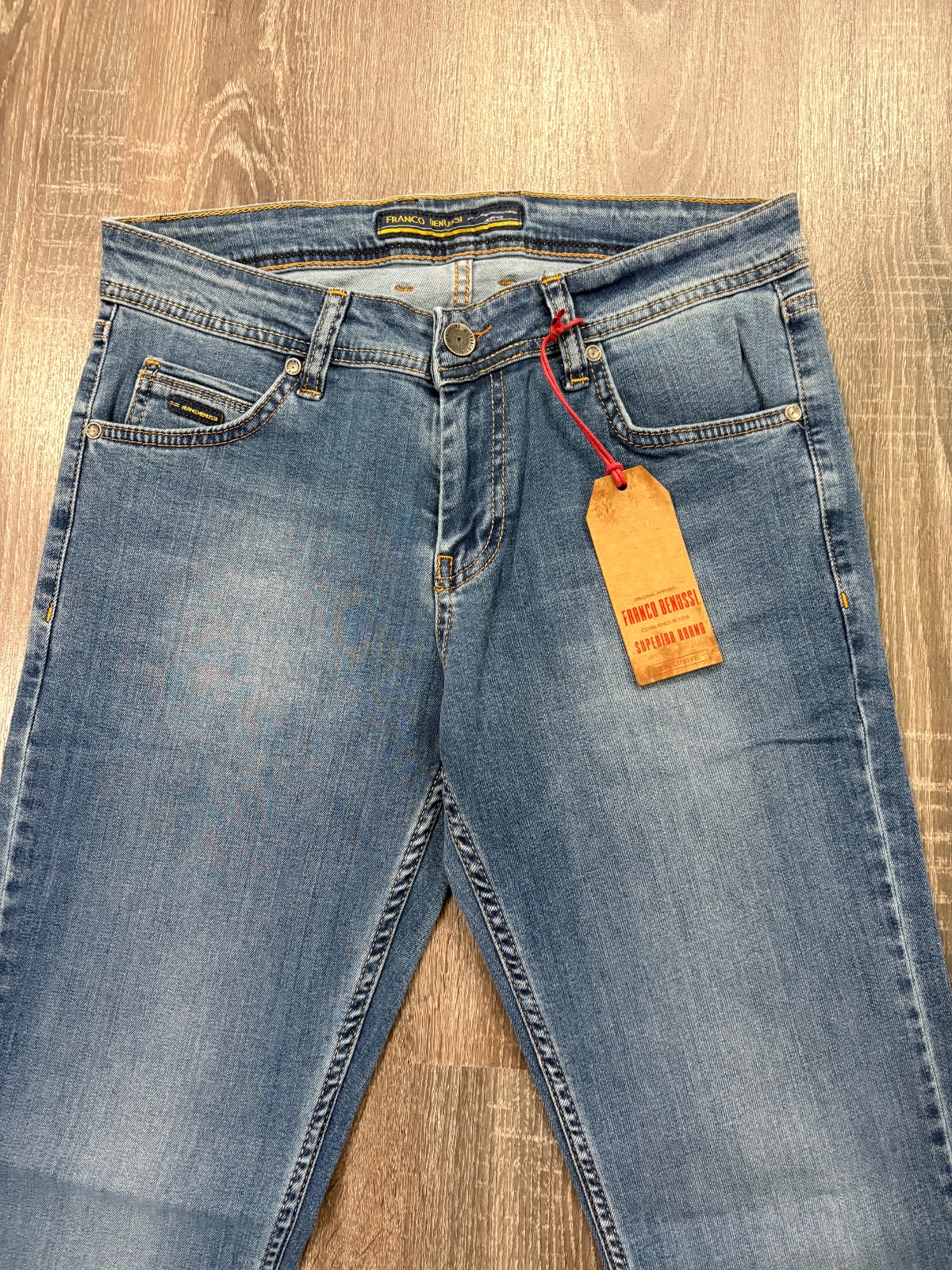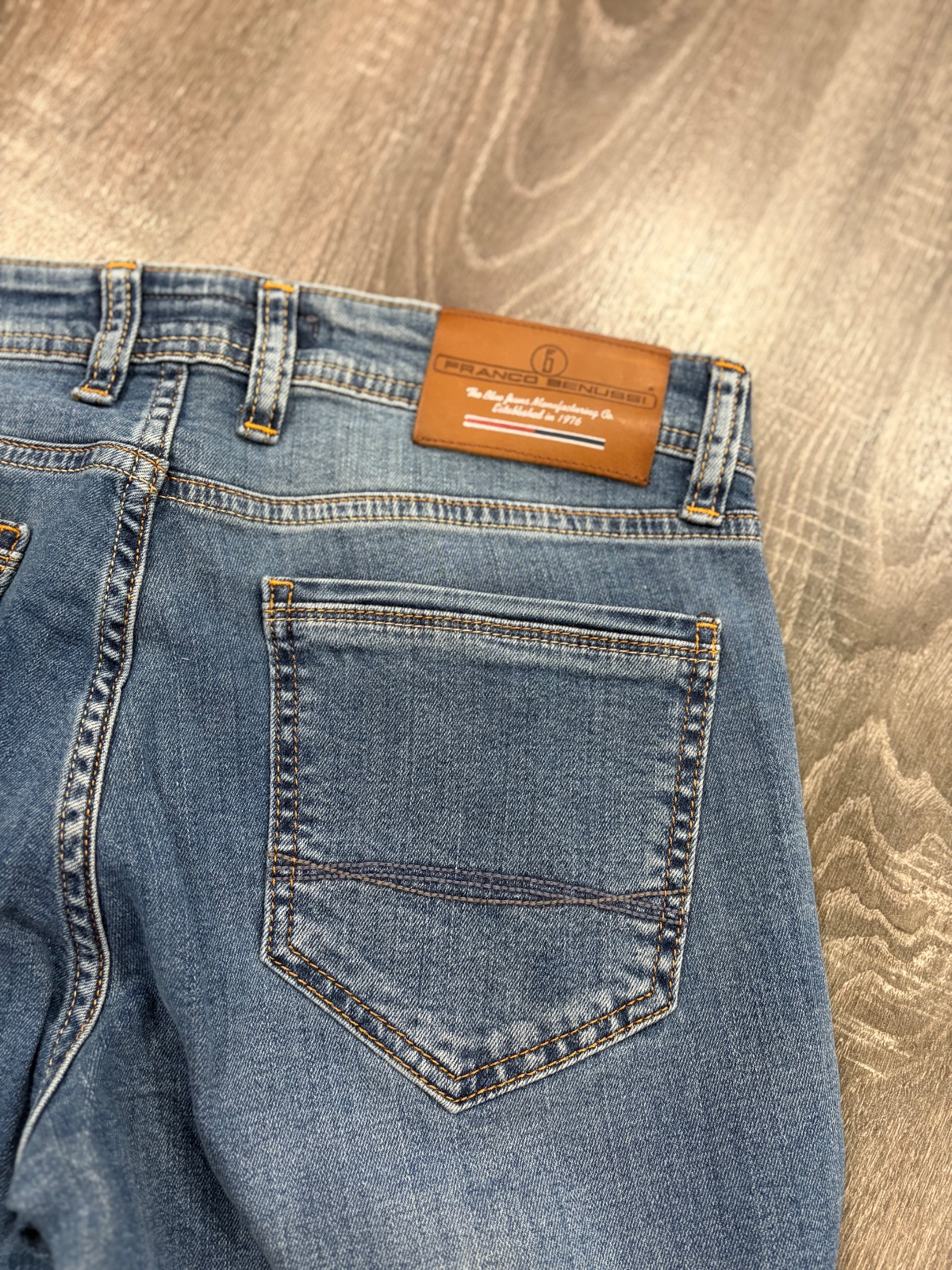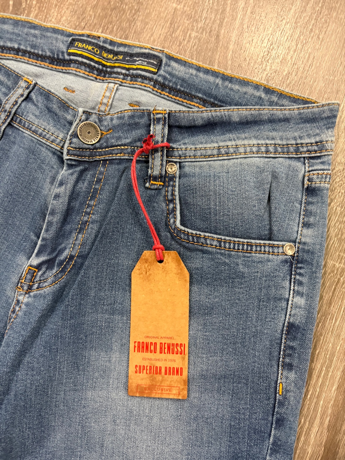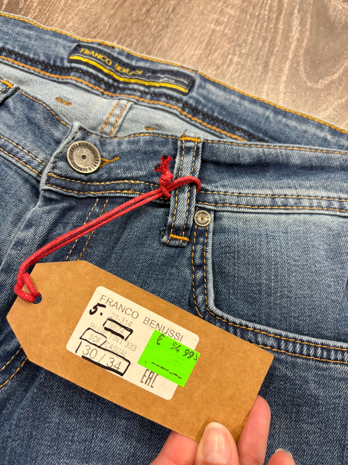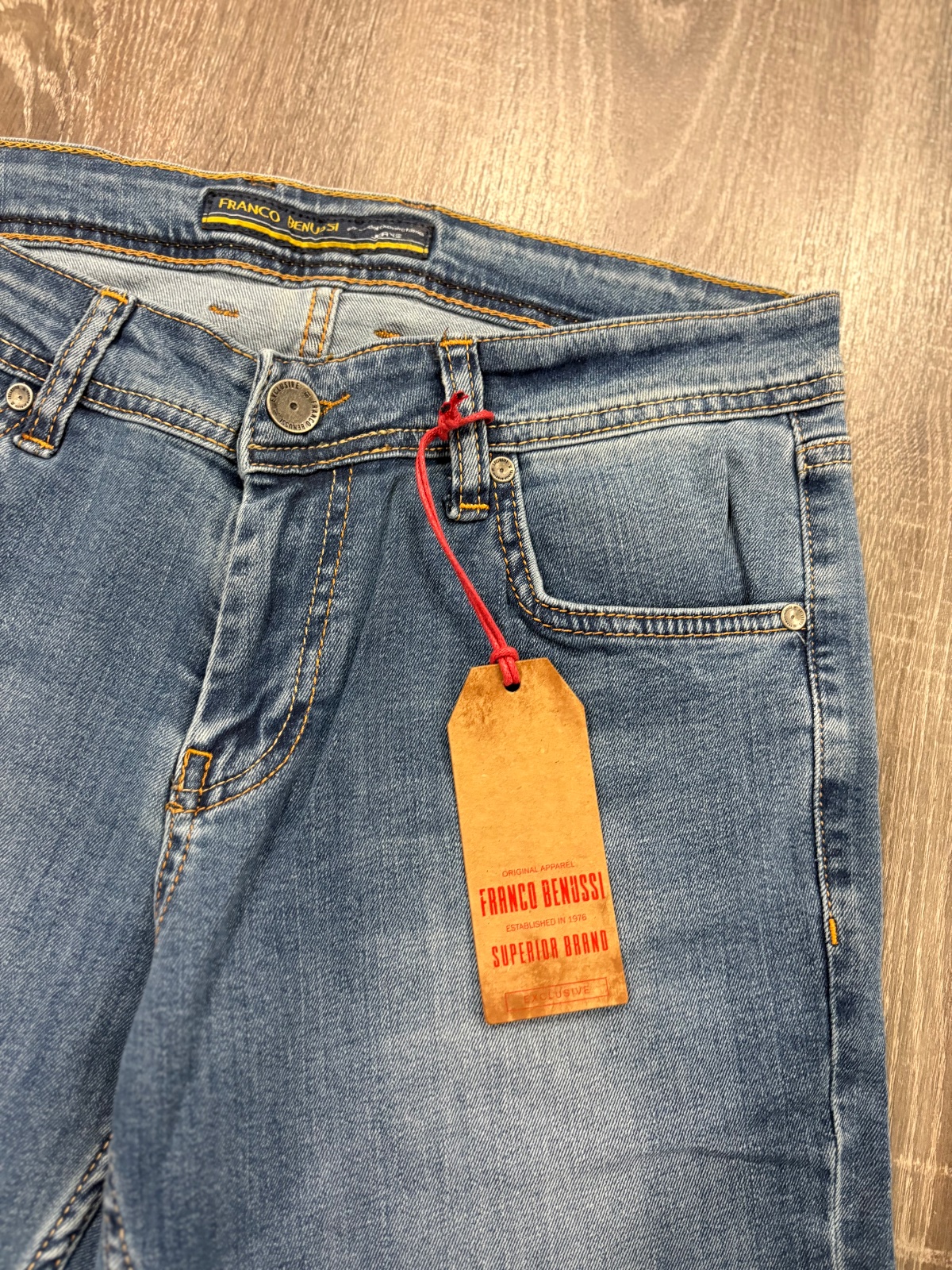 FRanco Benussi nove panske riflove nohavice,komplet s etiketou,PC 55 eur, material bavlna a elastan,velkost W30 L34,dlzka je 106cm,sirka v pase je cca 39x2cm,predny sed je 24cm a zadny je 35cm,sirka stehna pod rozkrokom je od 28x2cm do 32x2cm,sirka dole je 18cm
