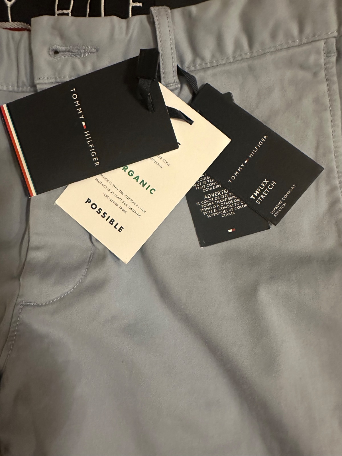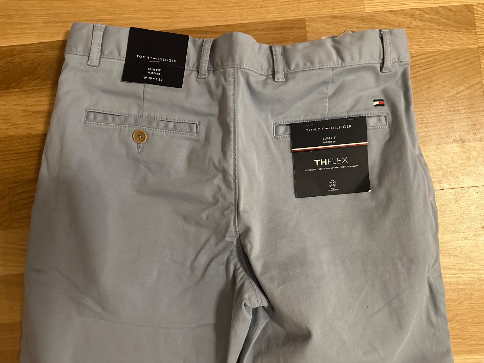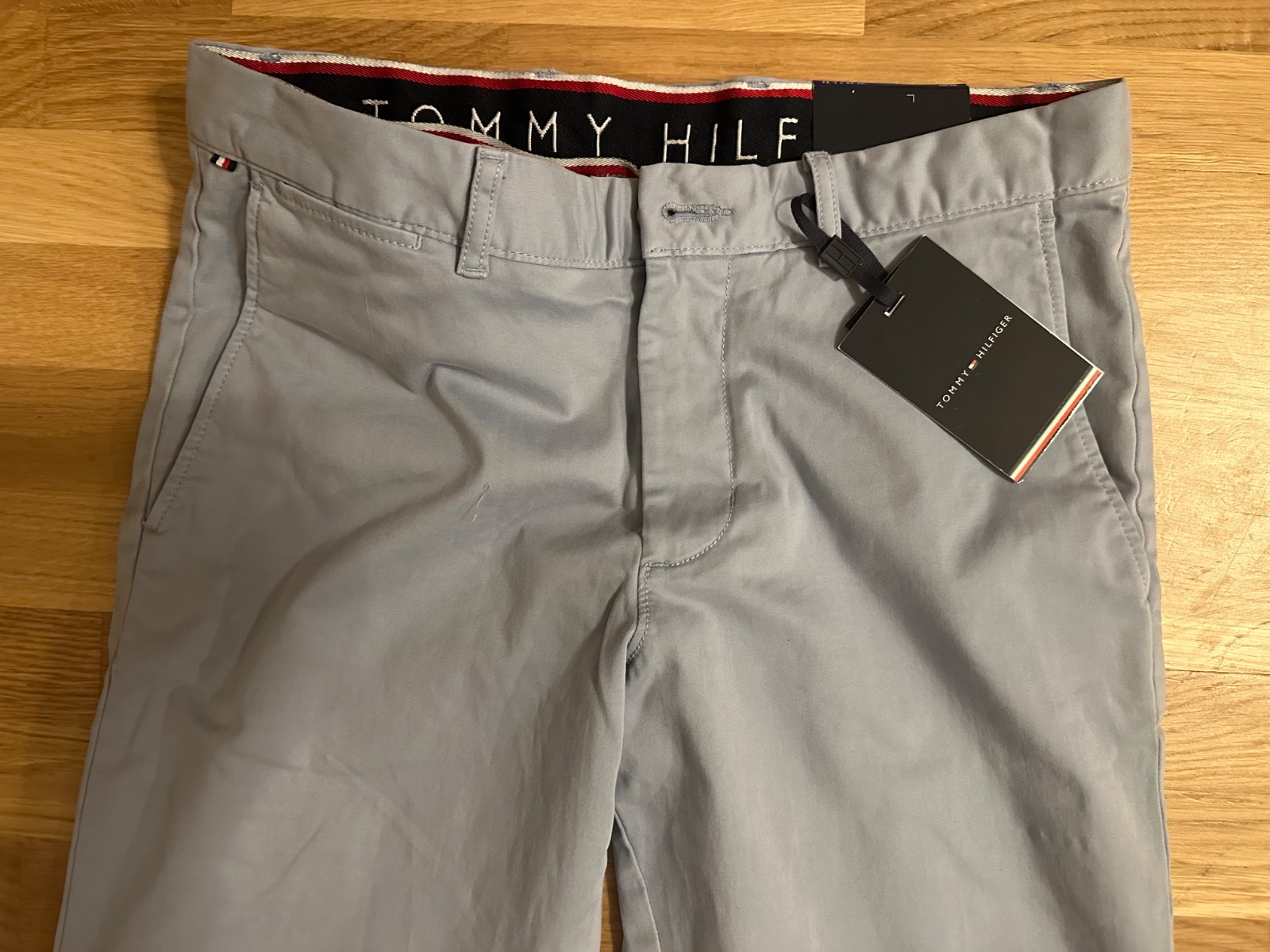 Kvalitné pánske nohavice s visačkami. Farba svetlá modrošedá. Veľkosť W30 x L32. Pás pevný s pútkami, dve bočné vrecká, dve zadné vrecká, náhradné gombíky. Materiál 98% bavlna 2%elastan. Rozmery: pás 85 cm, dĺžka 100 cm. Top stav.