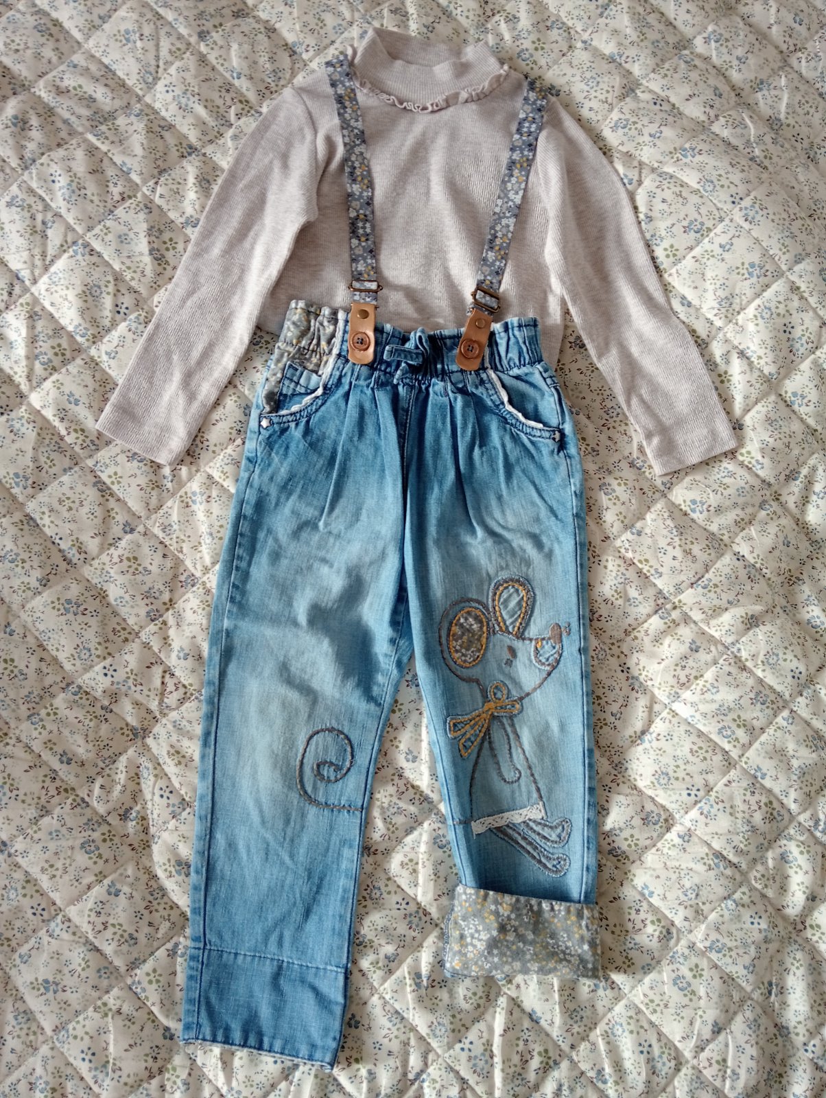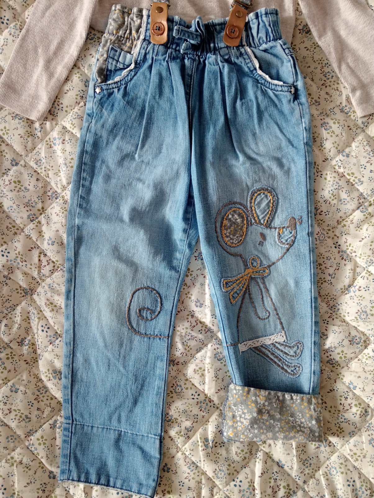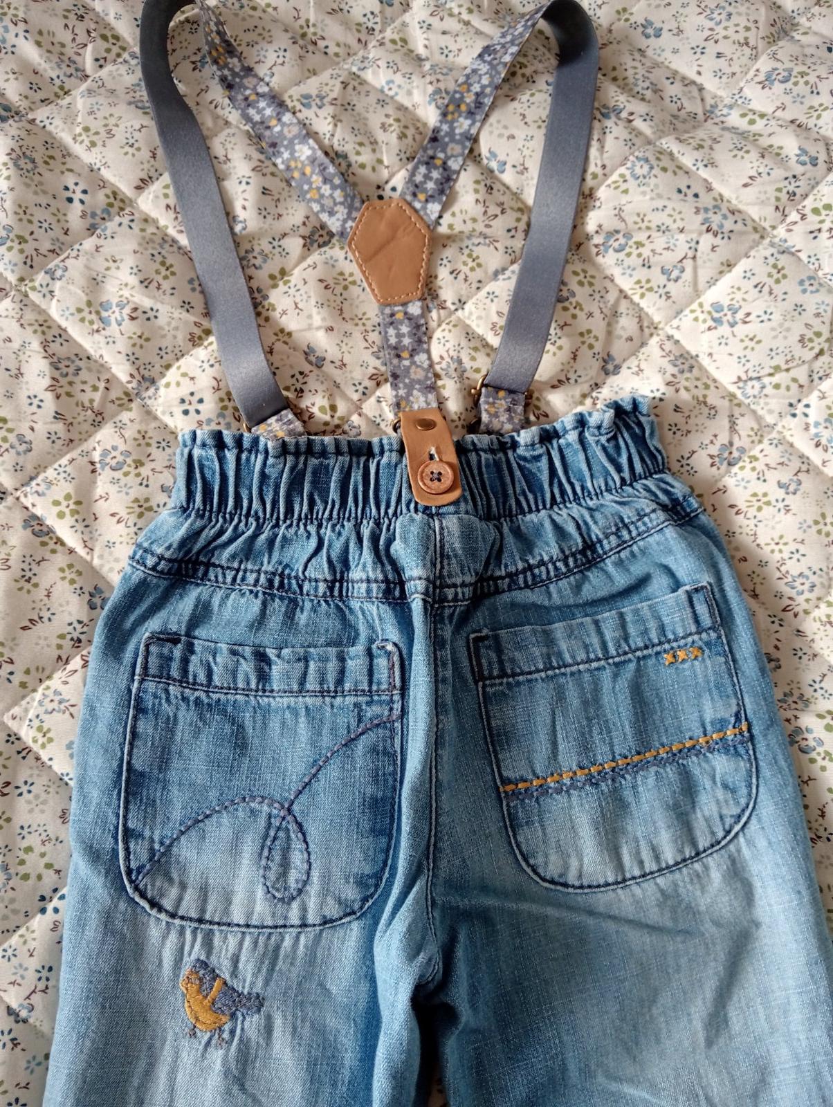 Predám krásne a praktické rifle s vyšívanou myškou. Odnímateľné nastaviteľné traky, funkčné vrecká, v páse guma, nositeľné v dvoch dĺžkach. Podhnuté 51 CM od pása, nepodhnuté 58 CM, šírka v páse v kľude 22 CM. Tenšie a mäkké. Naozaj odporúčam. Výborný stav. Grátis koláčik Zn. Materiál v. 98.