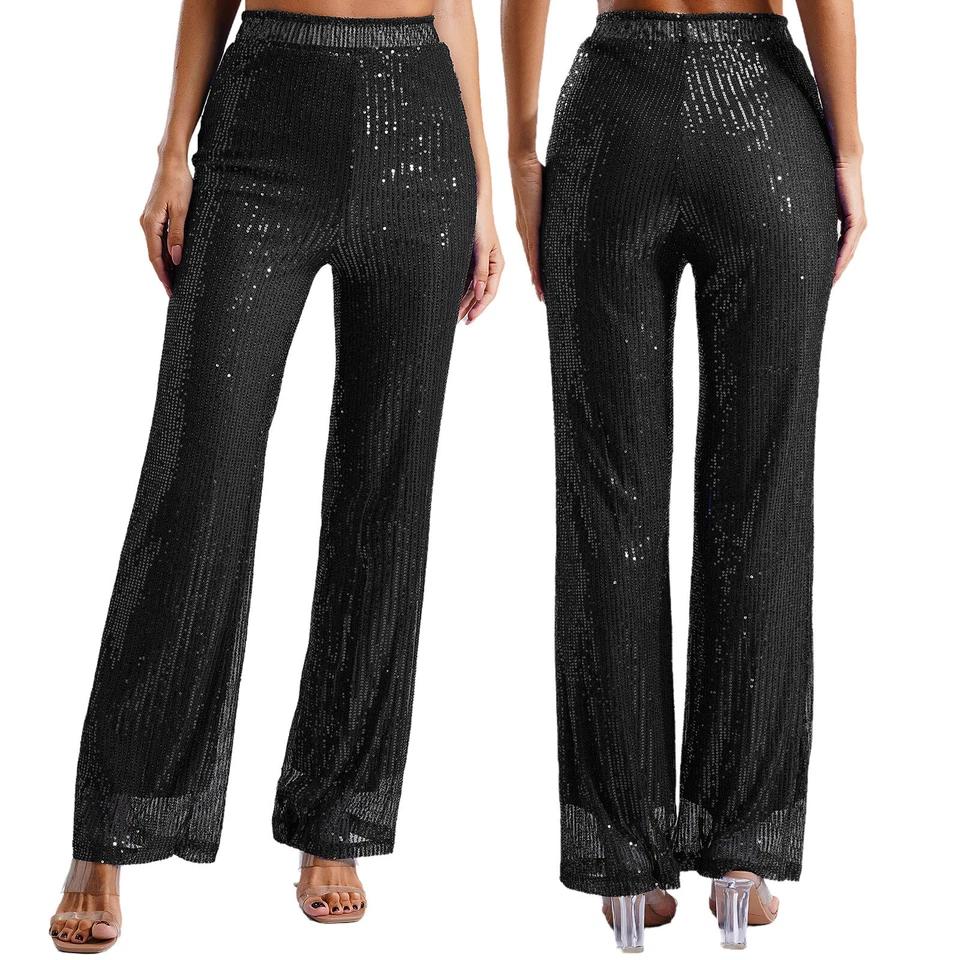 Moderné čierne nohavice s lesklou potlačou
