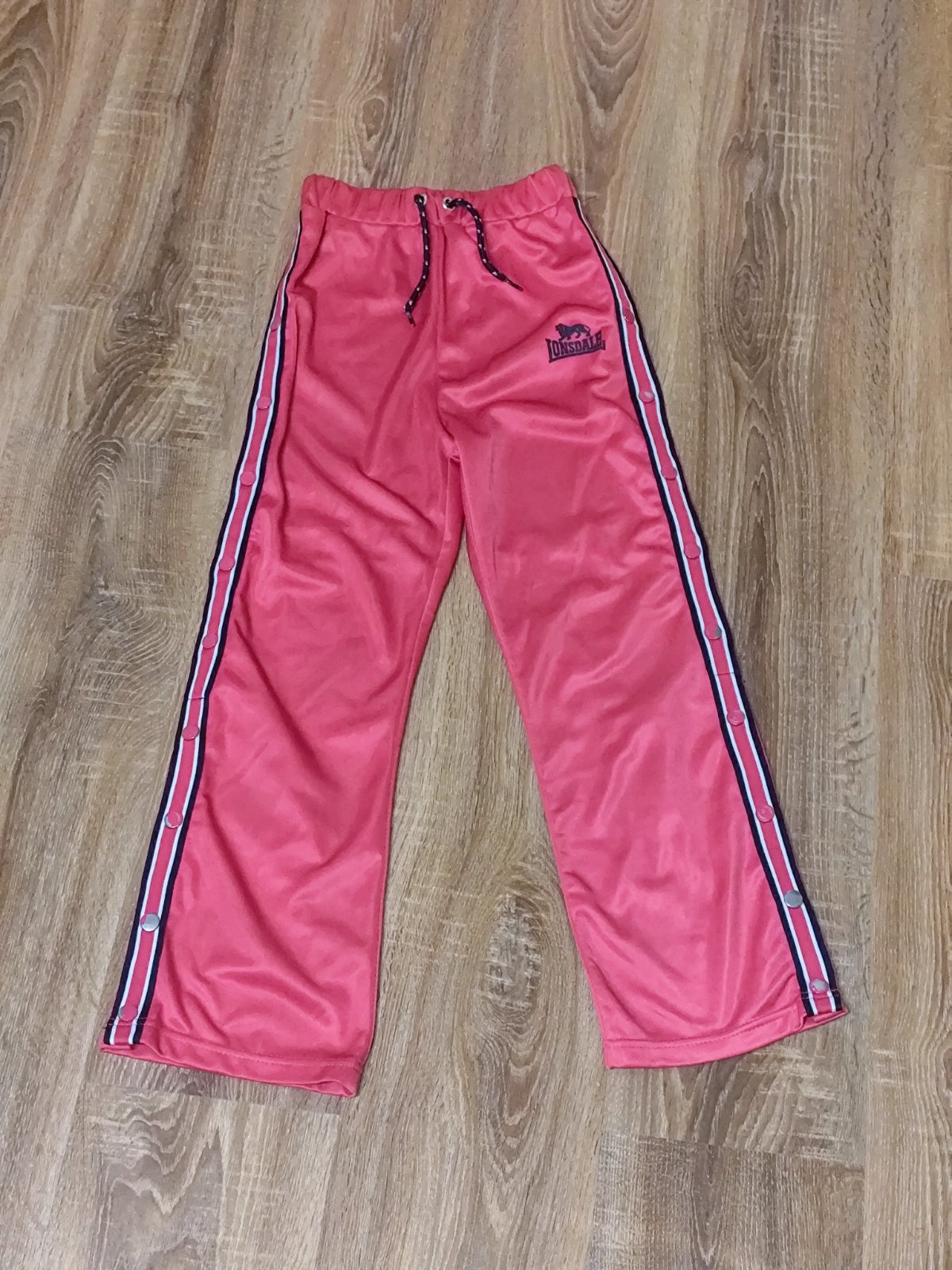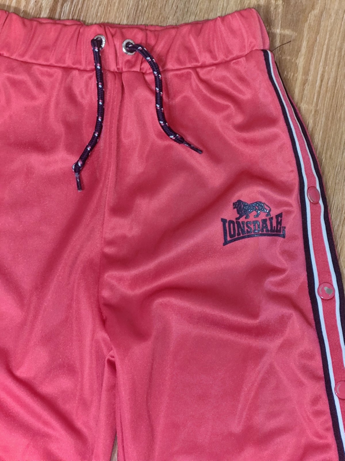 Nohavice Lonsdale vo veľmi dobrom stave, po bokoch vrecká a gombíky. Veľkosť uvedená 134/140. Jemne ošúchana farba na pár gombikoche.