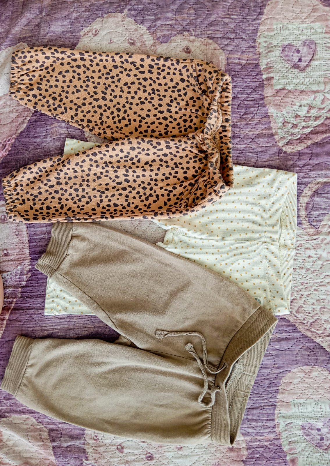 Tepláky vľavo sú značka hm, legíny v strede Lindex a tepláčiky vľavo Fred flo. Všetko bez chyby.