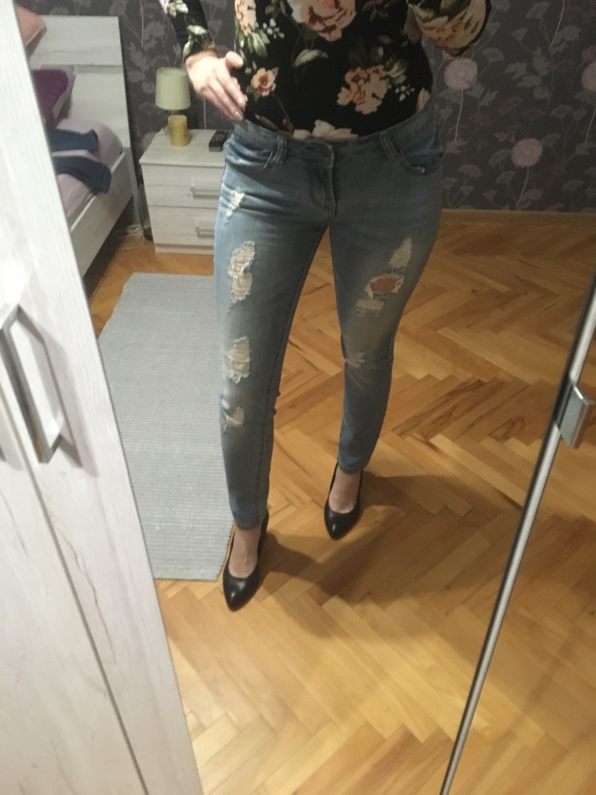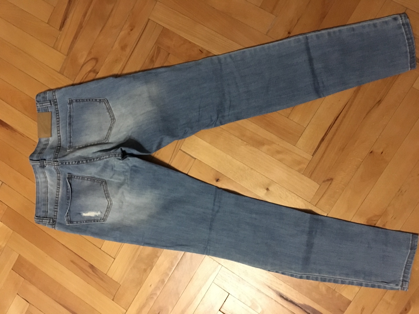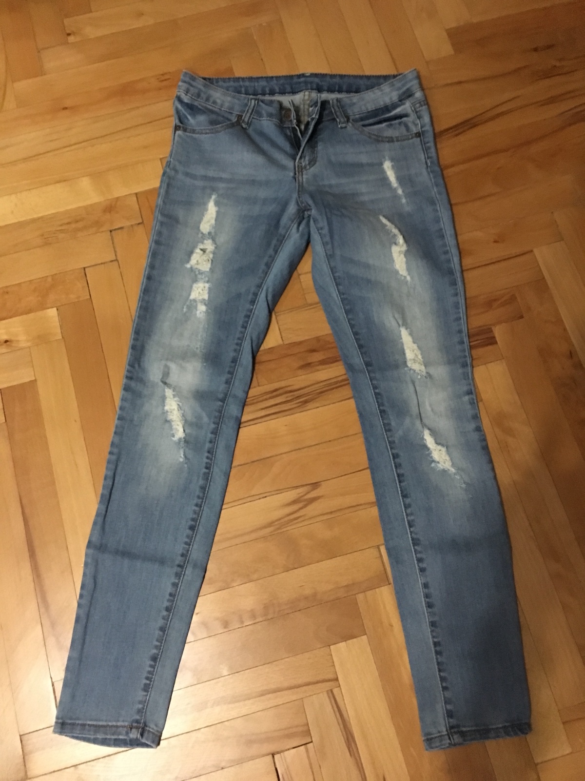 Predám krásne rifle s dierami, raz oblečené. Veľkosť 28. Kupované v New Yorkeri. Pás 38 cm, dlzka od pasa dole 96 cm.