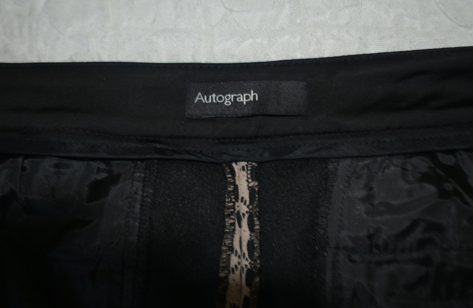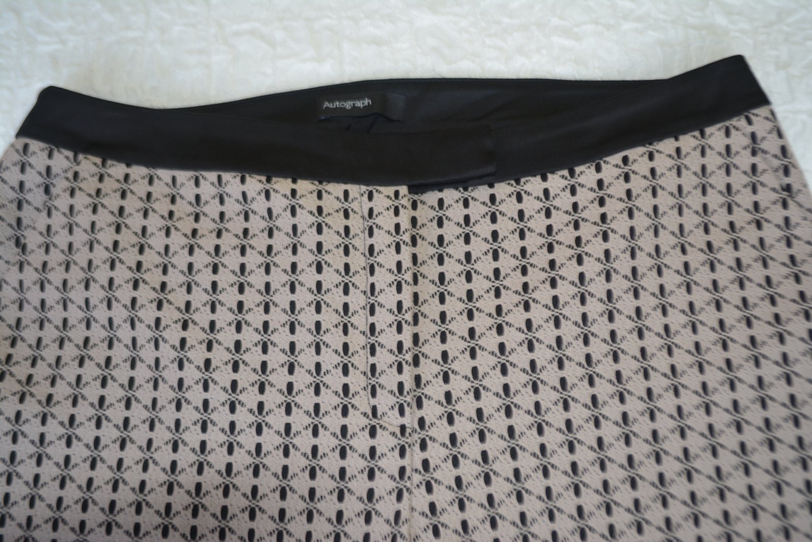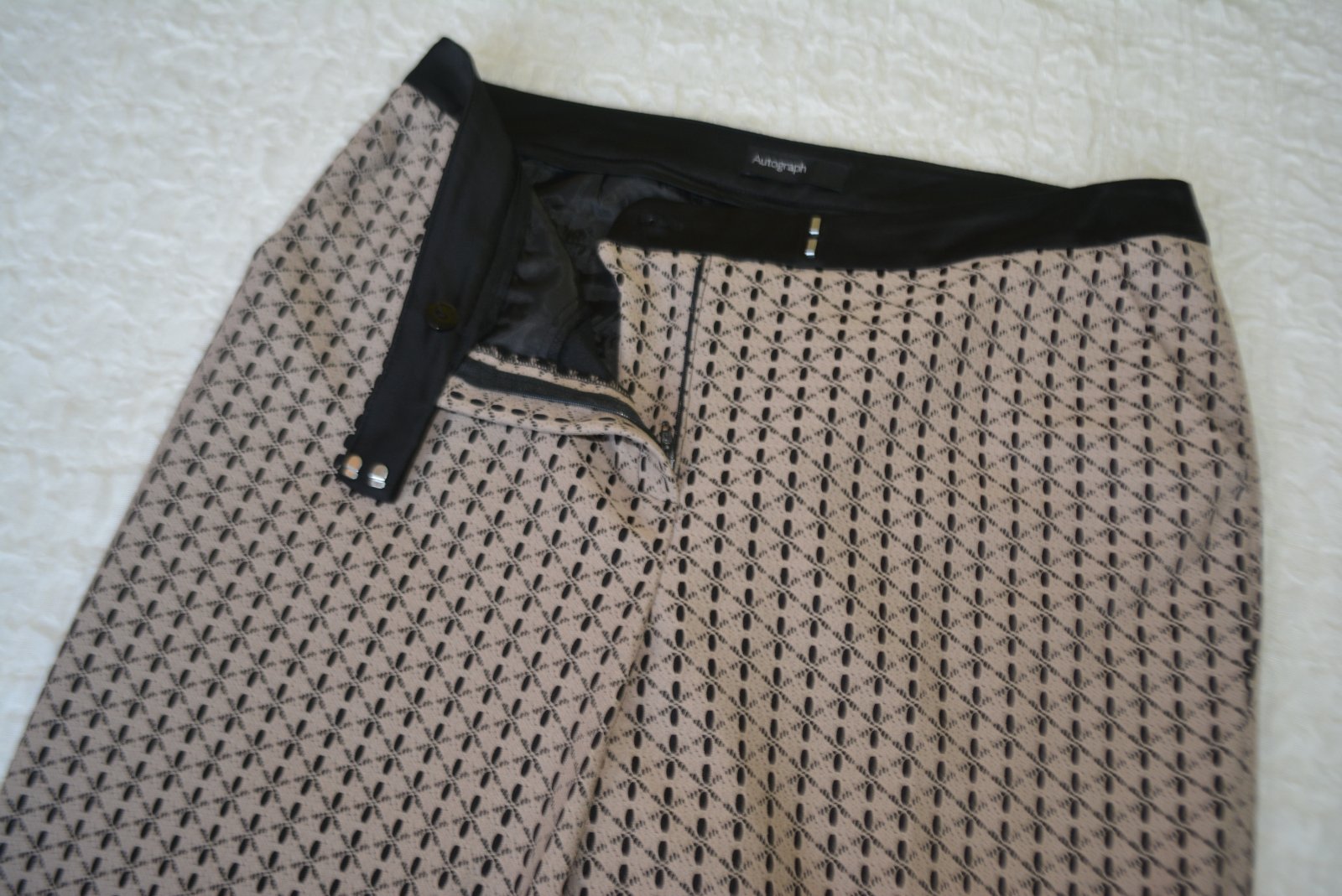 Nohavice Autograph, Marks & Spencer, veľ. L - rozmery: bočná dlžka 96cm, od rozkroku 68cm, pás 2x44cm, predný sed 29cm, zadný sed 43cm. Šírka stehna 10cm pod rozkrokom je 31cm, v oblasti kolena 23cm a celkom dole 20cm.