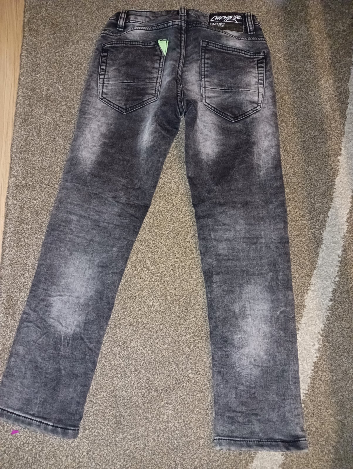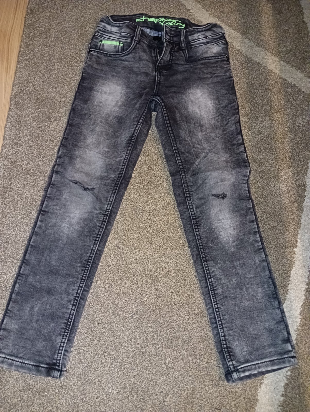 Riflovina je mäkká, poddajná, na oboch kolenach diery, ktore sa urobili nosenim, ale vyzeraju ako original. Rifle su zachovalé, nie je poznat znamky nosenia. Syn ich nosil rád.