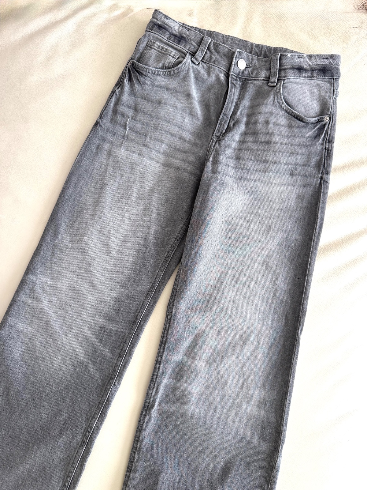 Rifle v štýle BAGGY boli nosené chvíľu, spodok nohavíc sme rozpárali, aby sa o trošku predĺžili, keďže dcéra rýchlo vyrástla a zrazu jej boli trochu krátke a v páse stále dobré. V páse je guma na reguláciu obvodu pása.