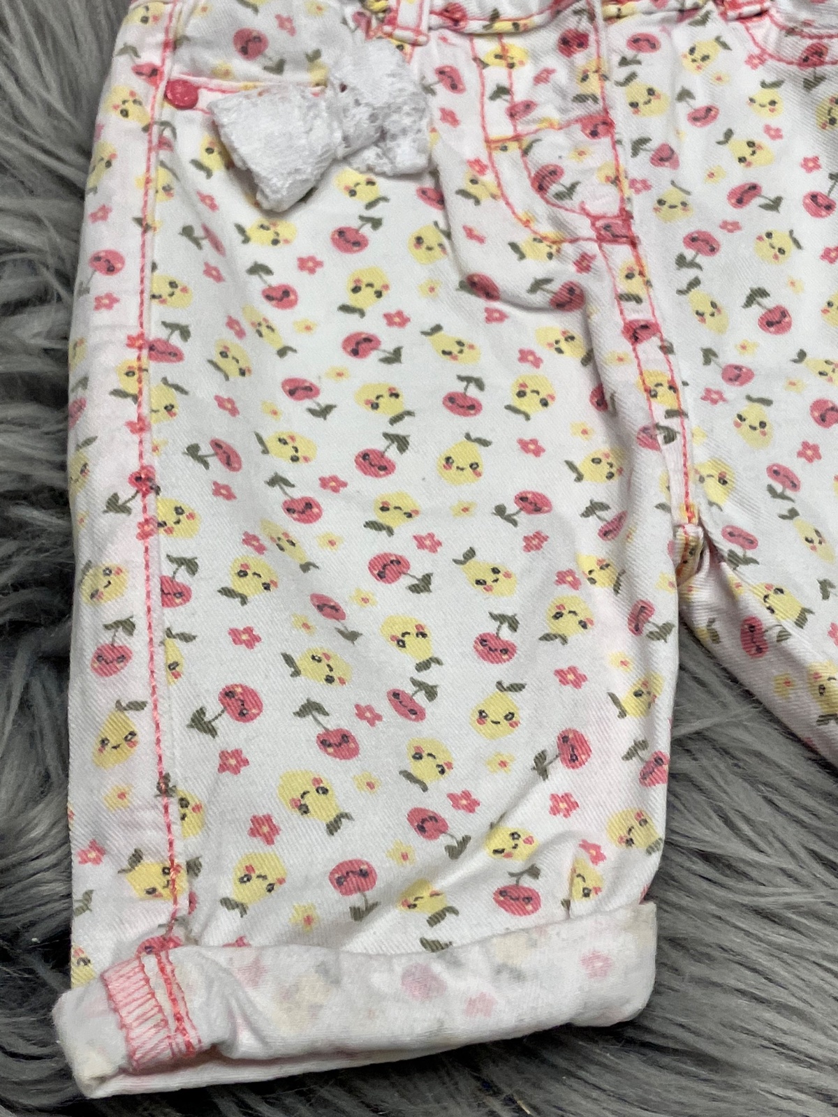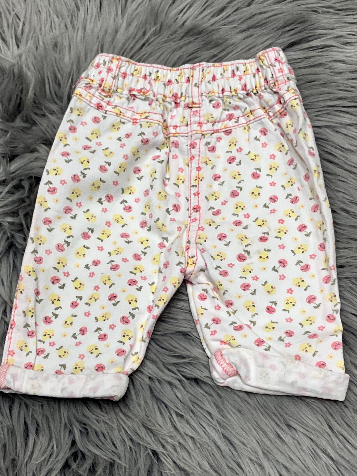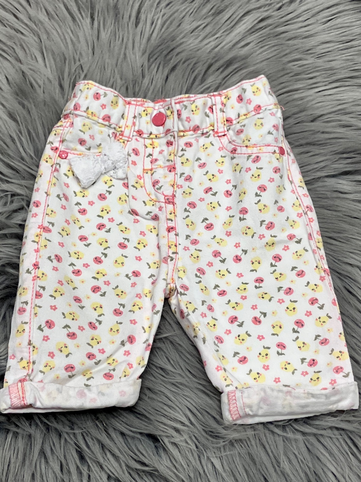 Dievčenské rifle s 3d mašličkou a vzormi, zapínanie na cvok, pútka na opasok, nastaviteľná guma v páse, materiál 100%bavlna. Farba: ružovo-žlto-zeleno-biela.