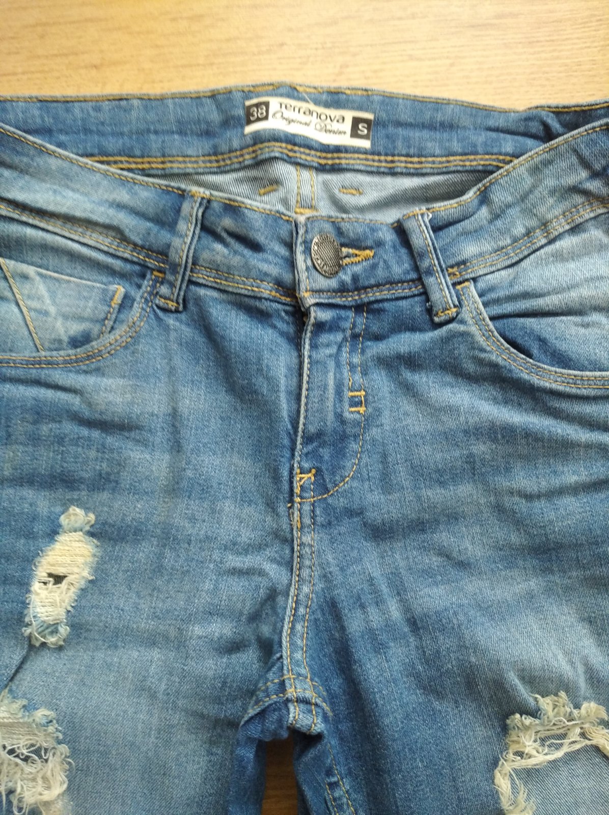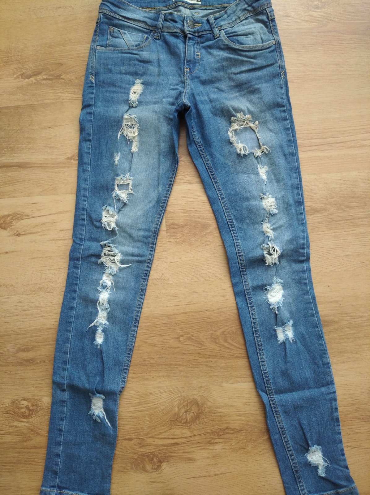 Veľmi pekne, minimálne nosené, elastické rifle, roztrhaný vzhľad.