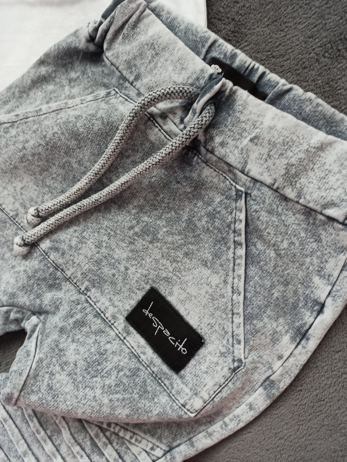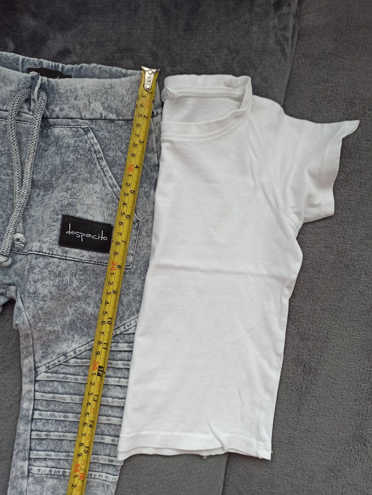 Pekný nosený stav, zašité dierky v oblasti vreciek a vzadu pri páse - pri nosení vôbec nevidno. Biele tričko pridám zadarmo