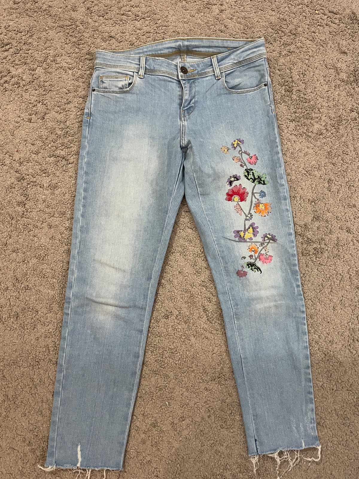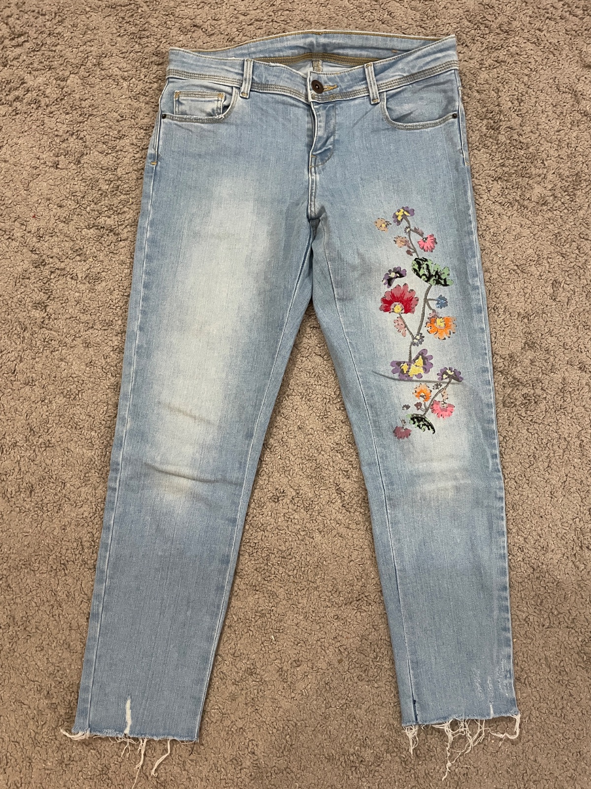 Krasne roztrhané rifle, elasticke, pas 32cm, boky 38cm, dl.92cm.
