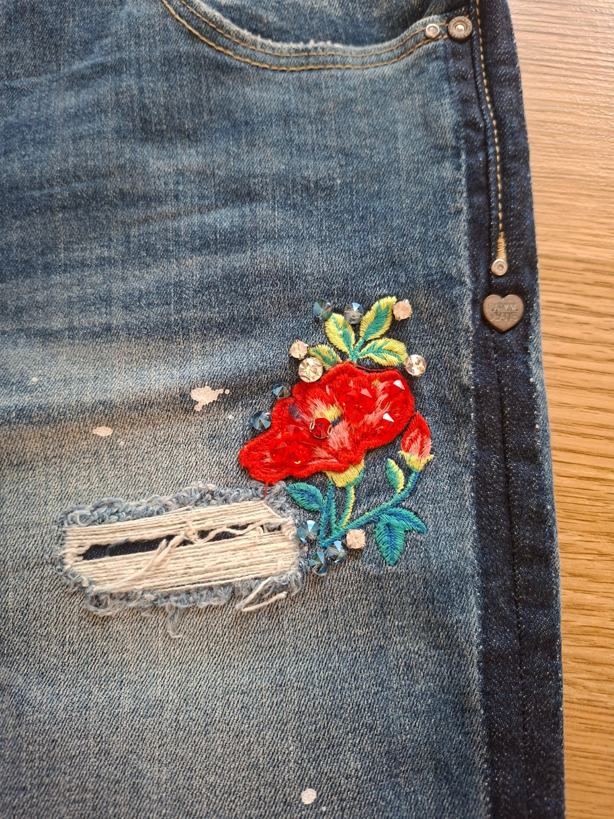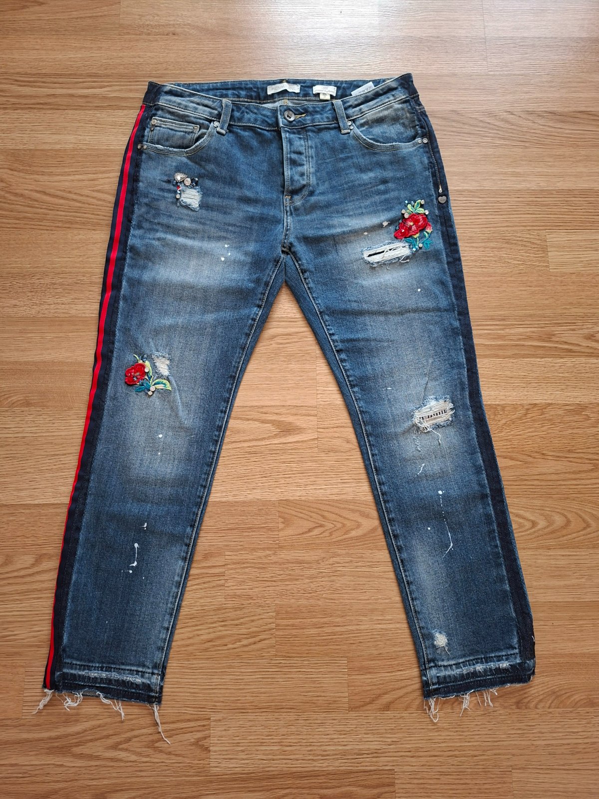 Rifle známej talianskej značky s peknými aplikáciami. 1 x oblečené=100% stav. Roztrhané časti sú podšité.