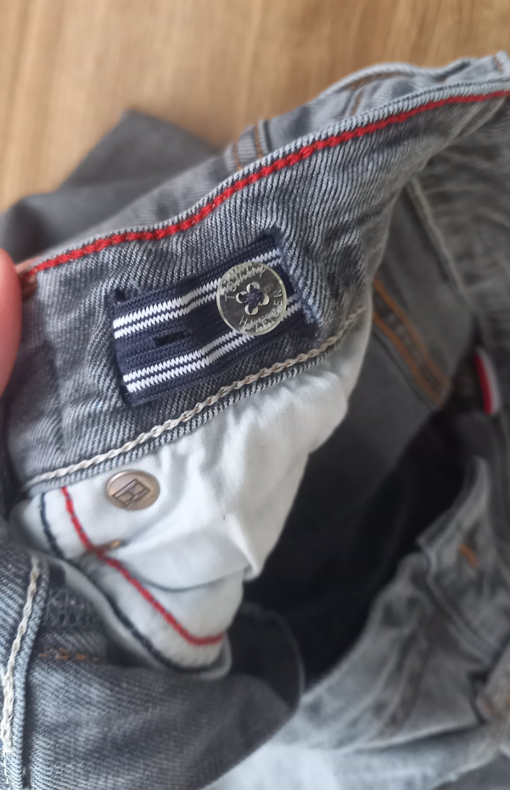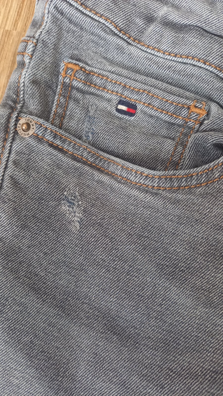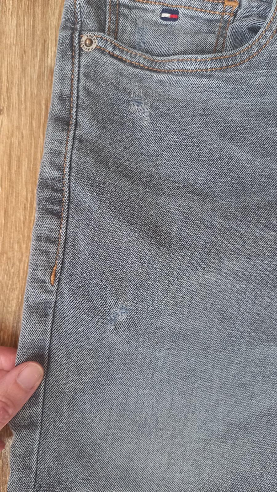 Krásne chlapčenské rifle Tommy Hilfiger príjemnej šedej farby. Boli nosené na striedačku s inými, sú stále krásne a bez závad. Na troch miestach sú ako keby vyšúchané (viď foto), ale tak boli originál kúpené. Pás sa dá doregulovať (viď foto).