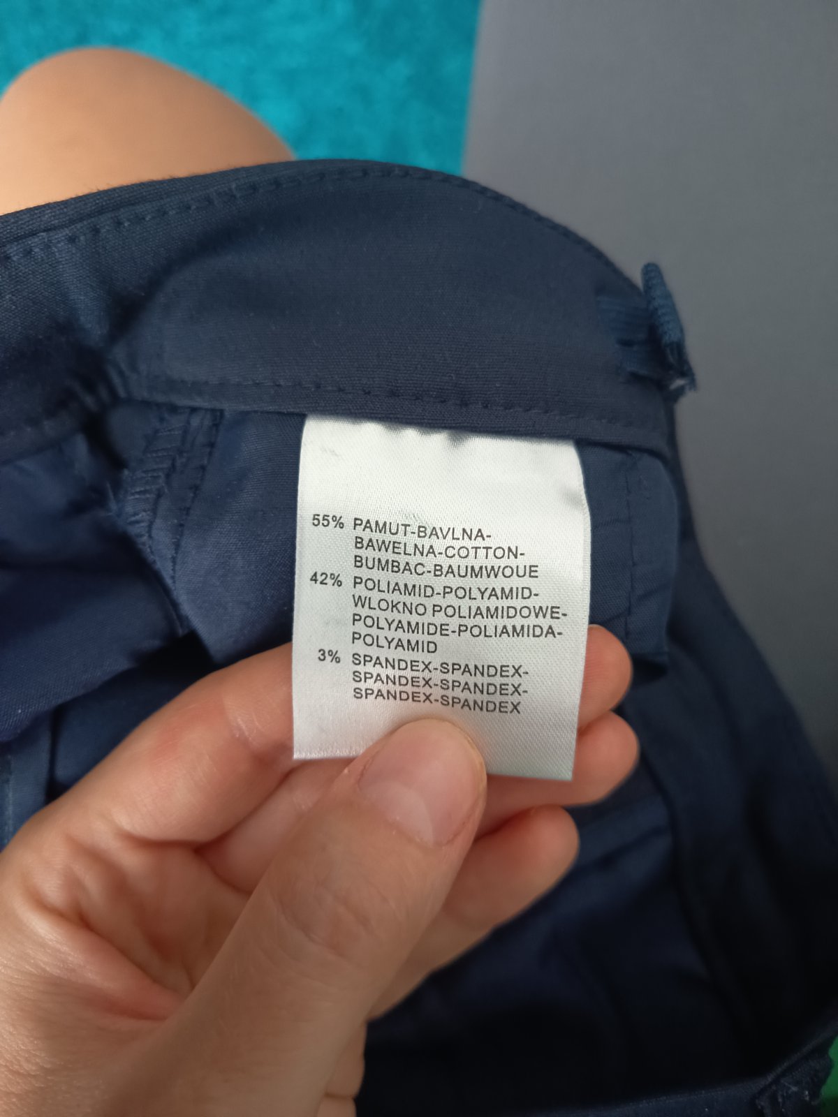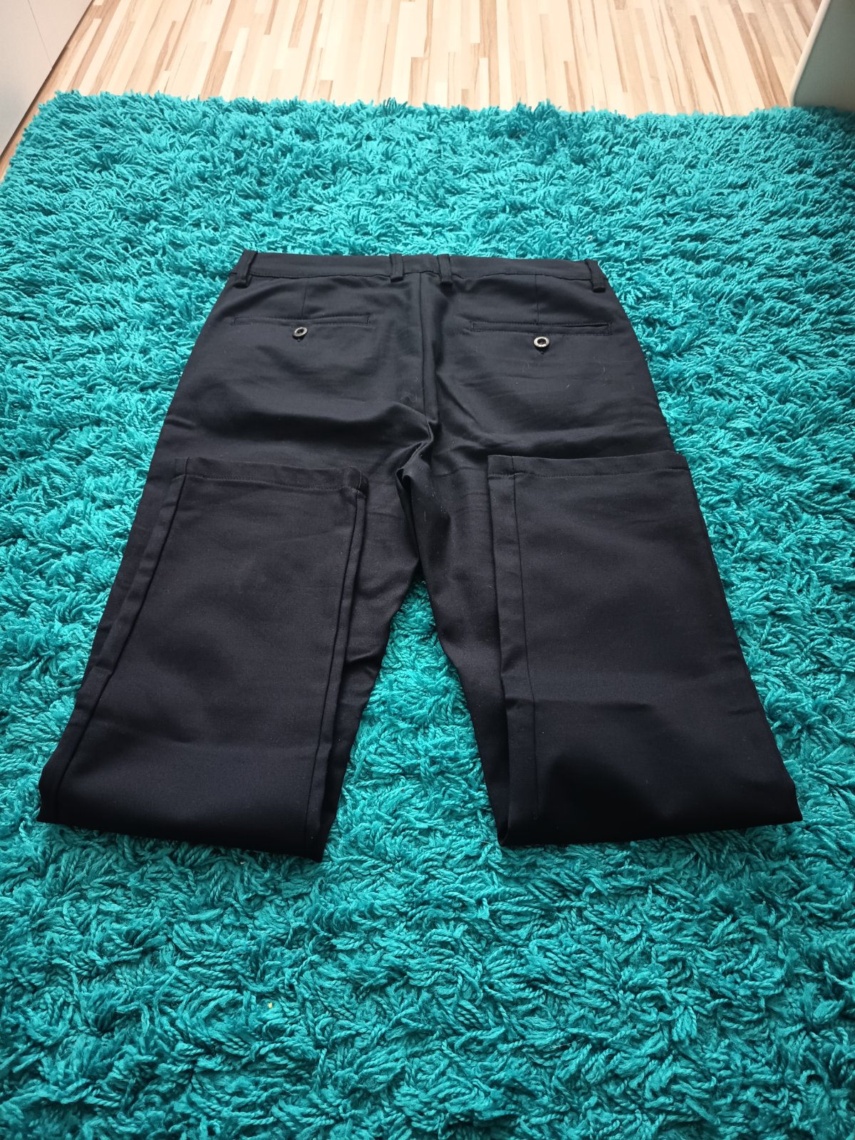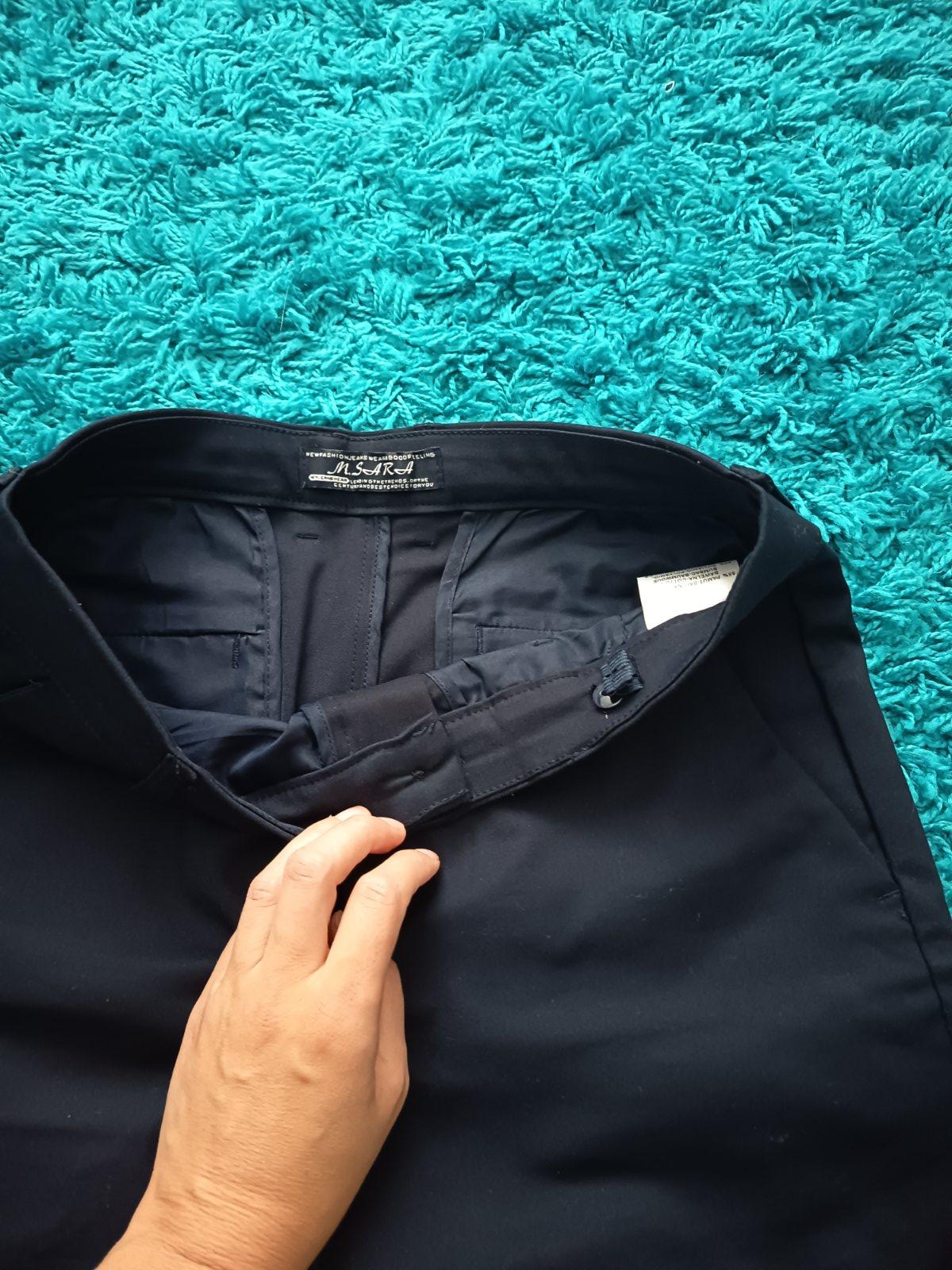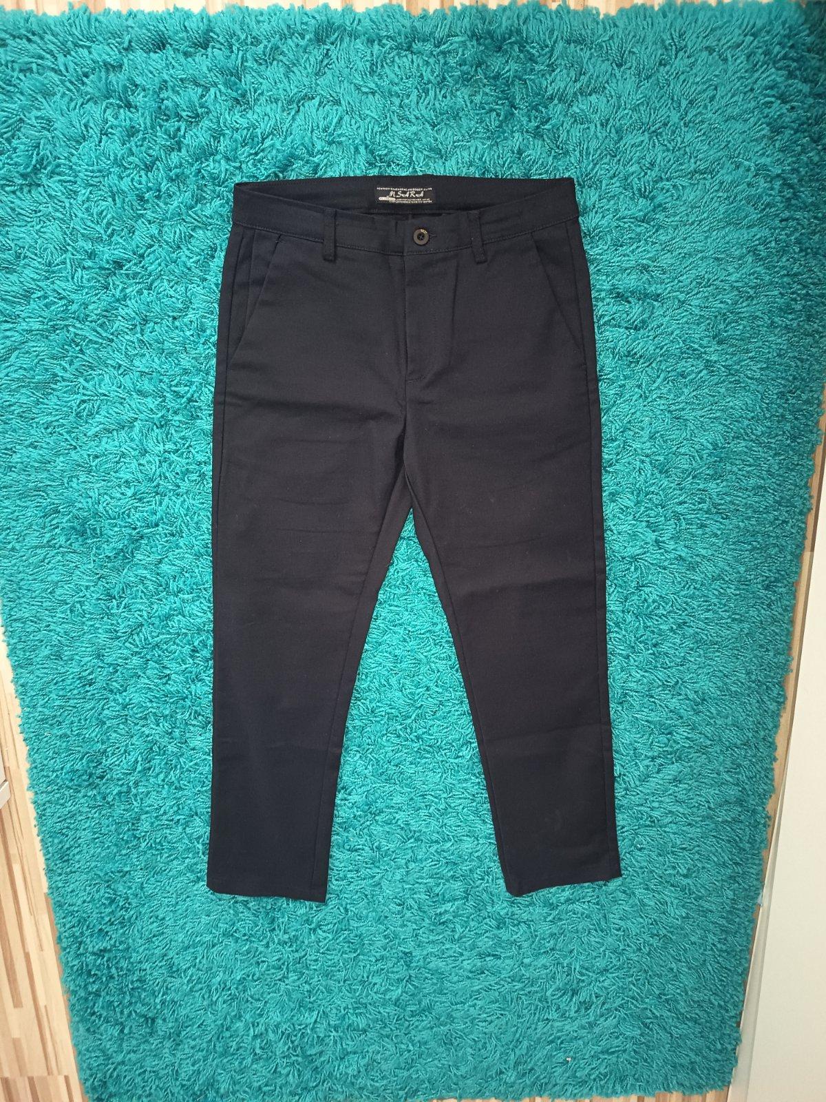 Tmavomodré slávnostné elastickejšie nohavice, syn mal na 1.sv.prijímanie...treba premerať, ine cislovanie... V pase maju aj gombik s gumou na prispôsobenie... Pas 37x2, boky 45,5cm, dlzka 90cm