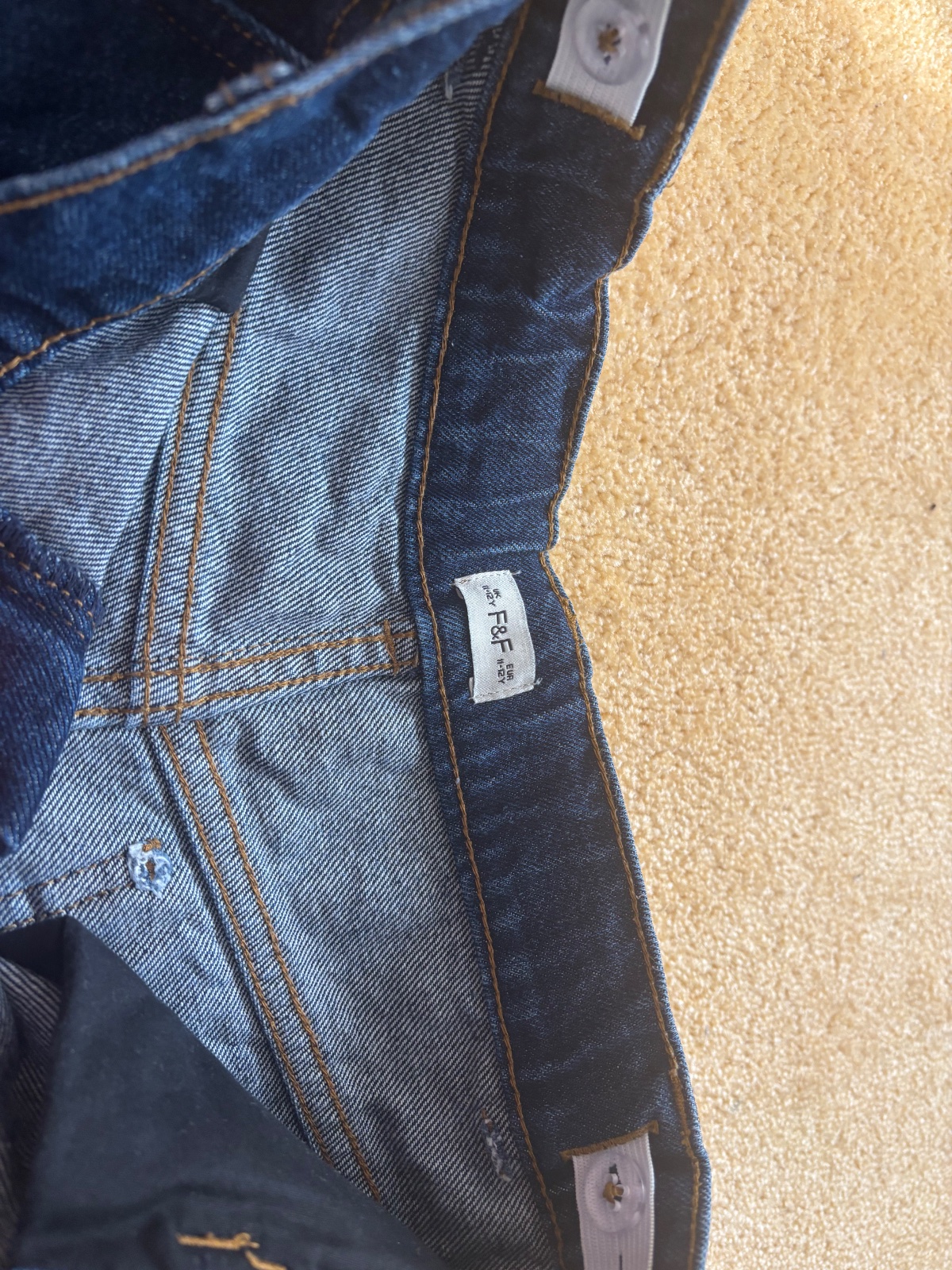Mäkké, bezchybné, elastické rifle. Vrecká vpredu aj vzadu, pás nastaviteľný, na gombík a zips. Celková dĺžka 81cm, dĺžka od rozkroku dolu 58m.