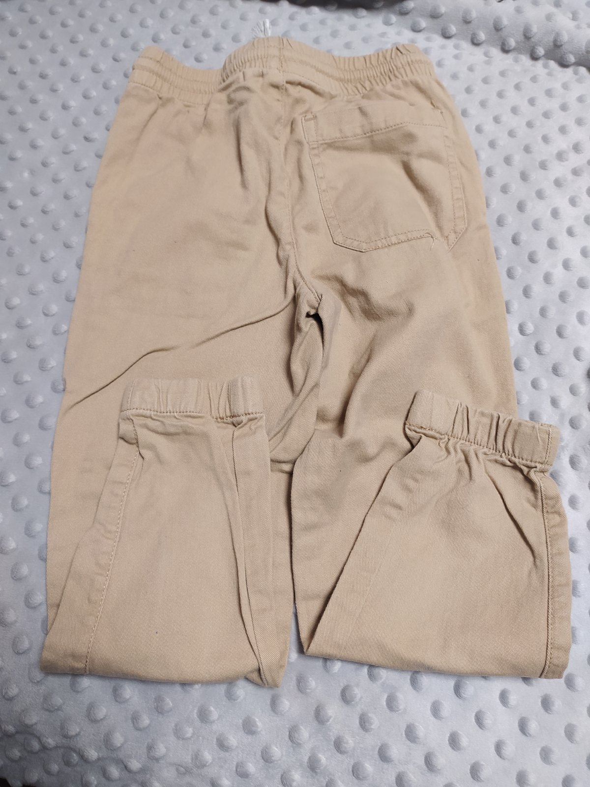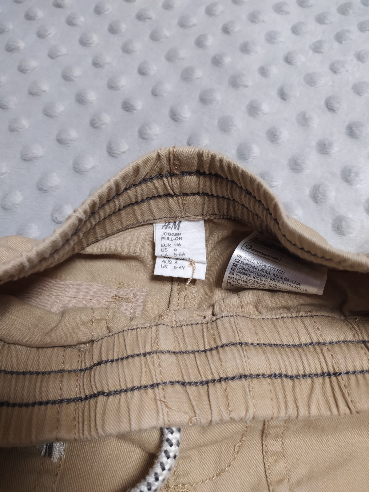 Bavlnené nohavice s elastickým pásom a gumičkami na nohách. Príjemné, mäkké, nosené príležitostne.