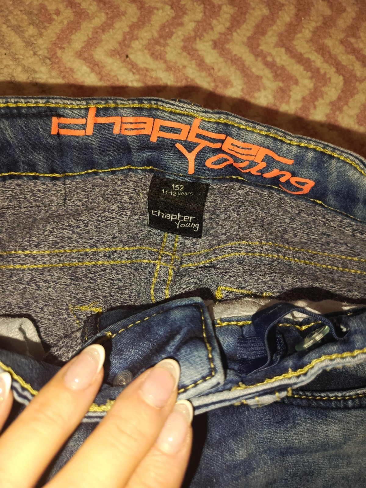 Rifle zn. Chapter Young (Takko), veľ. 152. Elastické, zapínanie na gombík + zips, 3 bočné vrecká + 2 zadné. Rozmery: postranná dĺžka 92 cm, od rozkroku dolu 67 cm, šírka v páse 32 cm.