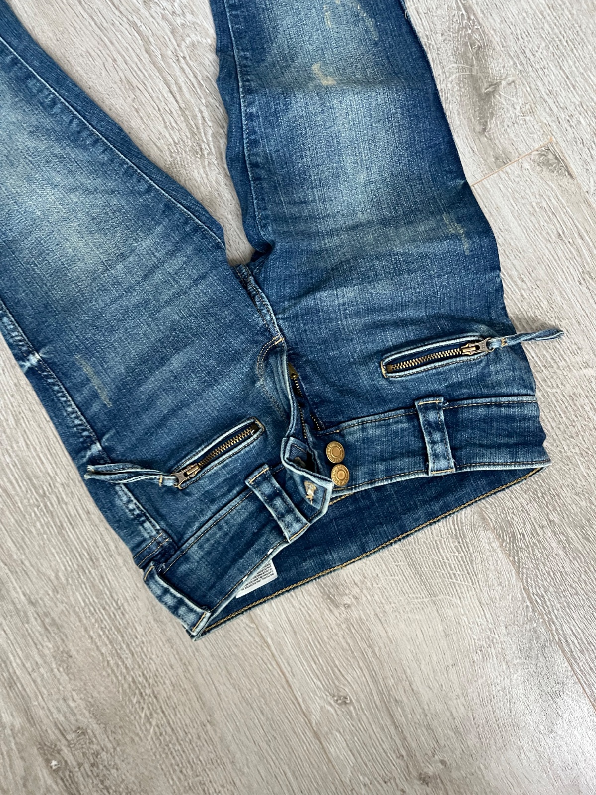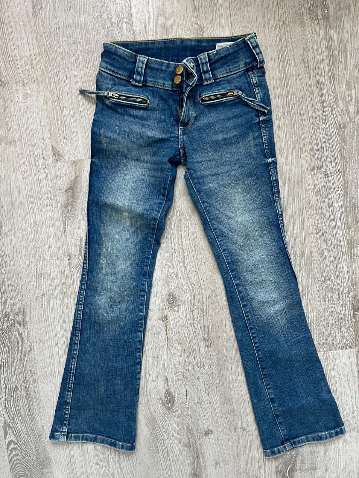 Výborné rifle po kolená . Odstrihnuté - vyzerajú ako originál ostrapkané. My sme mali veľa rifliel tak sme tieto odstrihli :-). Nezošúchané - výborný stav - elastické. Uvedená veľ 146. Nameraná D ...