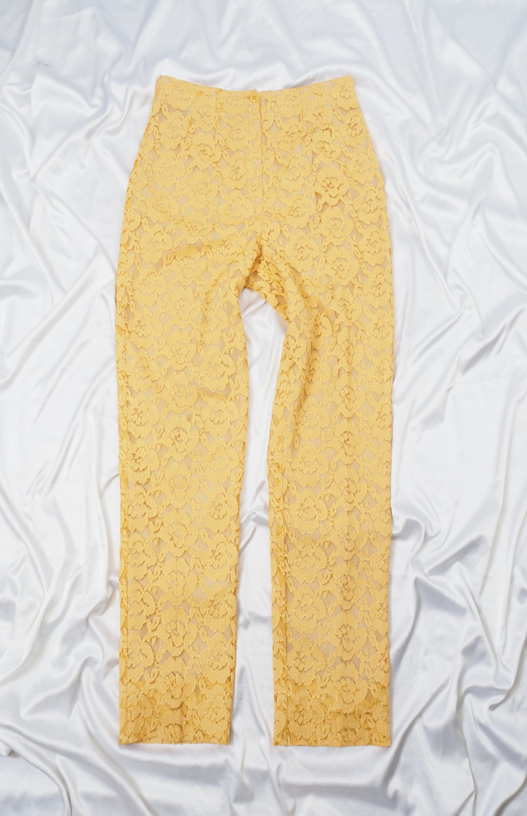 Kvalitné žlté nohavice čipkované s podšívkou, zapínanie na zips a gombík, materiál 90% viskóza, 10% nylon, super stav.